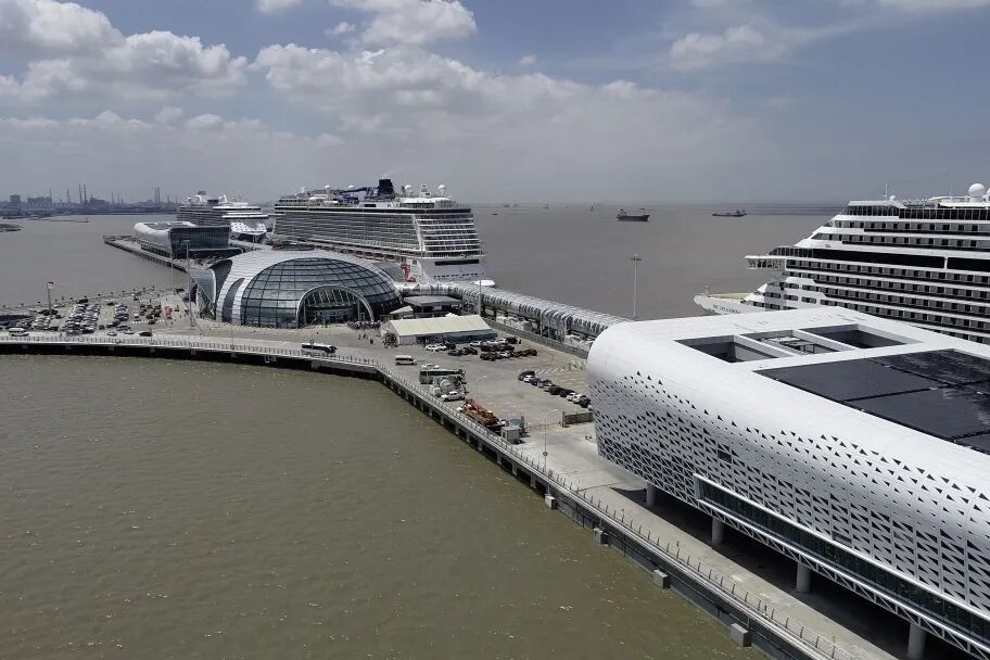 上海吴淞口国际邮轮港位于宝山区长江岸线的炮台湾水域,为中国门户邮轮母港。邮轮港整体造型以“海上画卷”为设计理念,中部为客运楼以“东方之睛”为形态概念,为椭球形建筑;两翼客运量采用长条形,布局形态犹如“东方之睛”两侧伸展出的“两幅画卷”;双向引桥寓意着宝山滨江带实现从“邮轮码头”到“邮轮城”的蜕变。