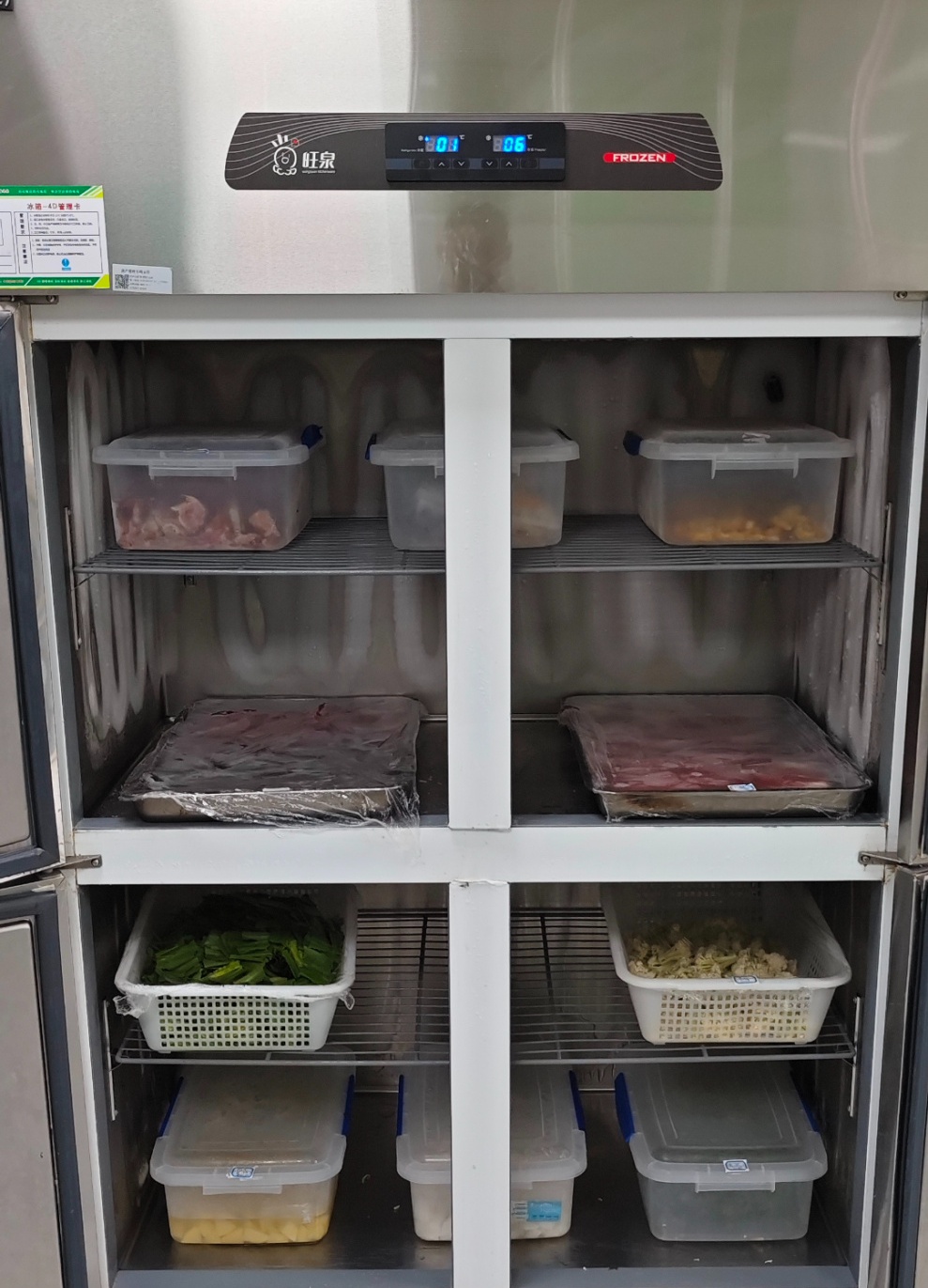 食品原料储存须生熟分开(生肉、生水产品与熟食品、即食食品分区域、分容器存放),分类分温(冷藏食品保持在0-8℃,自制食品冷冻保持在-12℃以下,预包装冷冻食品保持-18℃以下);定期清查库存,及时清理过期、变质或感官异常(如蔬菜腐烂、肉类发臭、水产品变色)食材。
