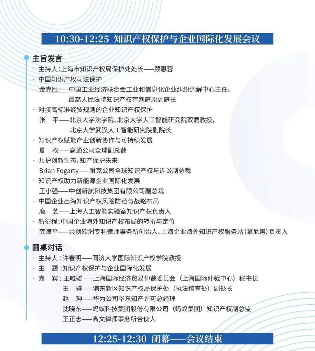 来自国内外知识产权相关机构、高校、企业的十余位专家学者将围绕“对接高标准经贸规则的企业知识产权保护”“国企出海知识产权风险防范与战略布局”“知识产权赋能产业创新协作与可持续发展”等议题,深入探讨知识产权保护新趋势及企业国际化发展的战略新路径,为企业加强知识产权能力建设,赋能国际化进程和可持续发展提供丰富的实践观察和思维洞见。