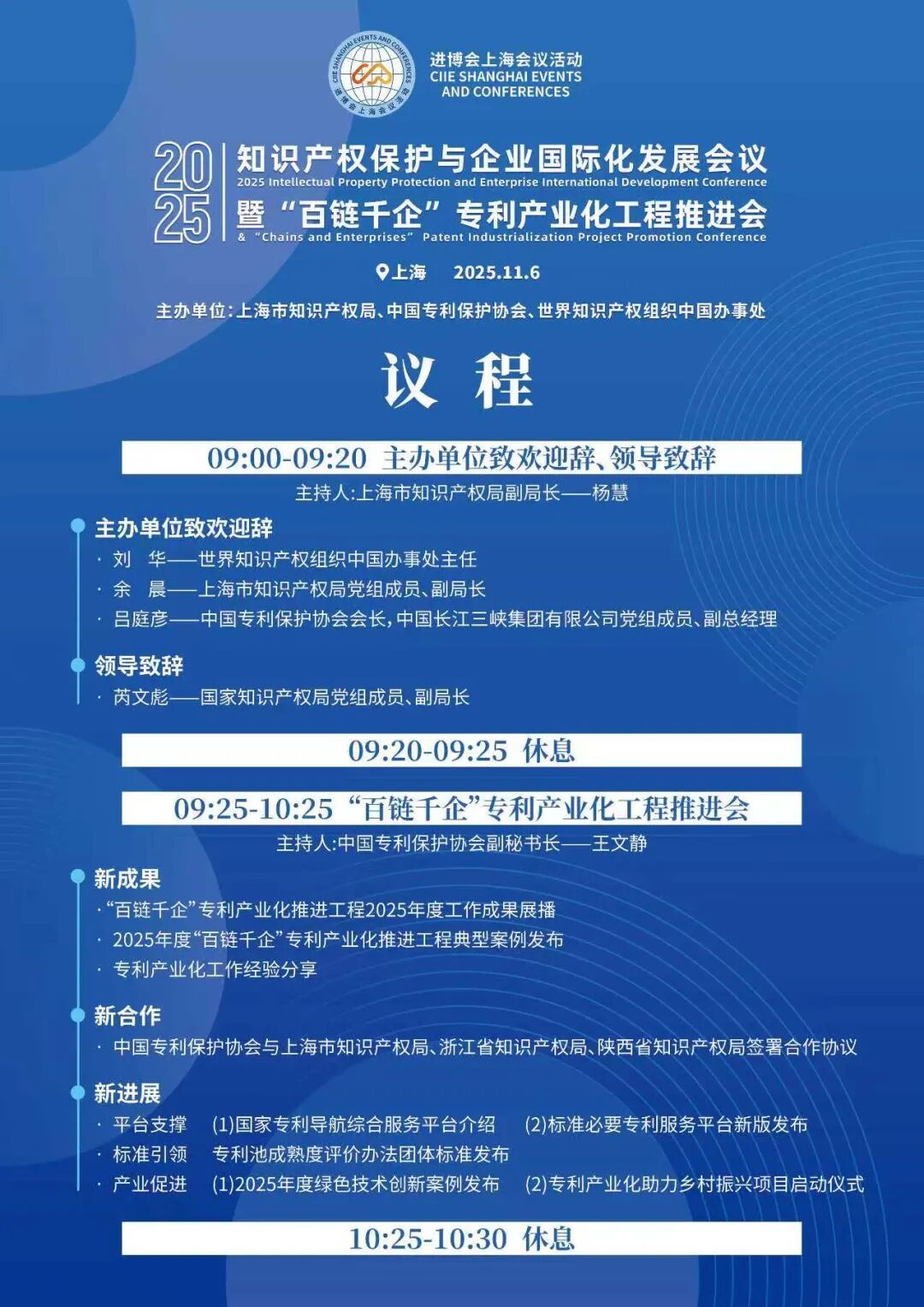 明天(11月6日),作为第八届进博会配套活动,“知识产权保护与企业国际化发展会议暨‘百链千企’专利产业化工程推进会”将在上海召开。