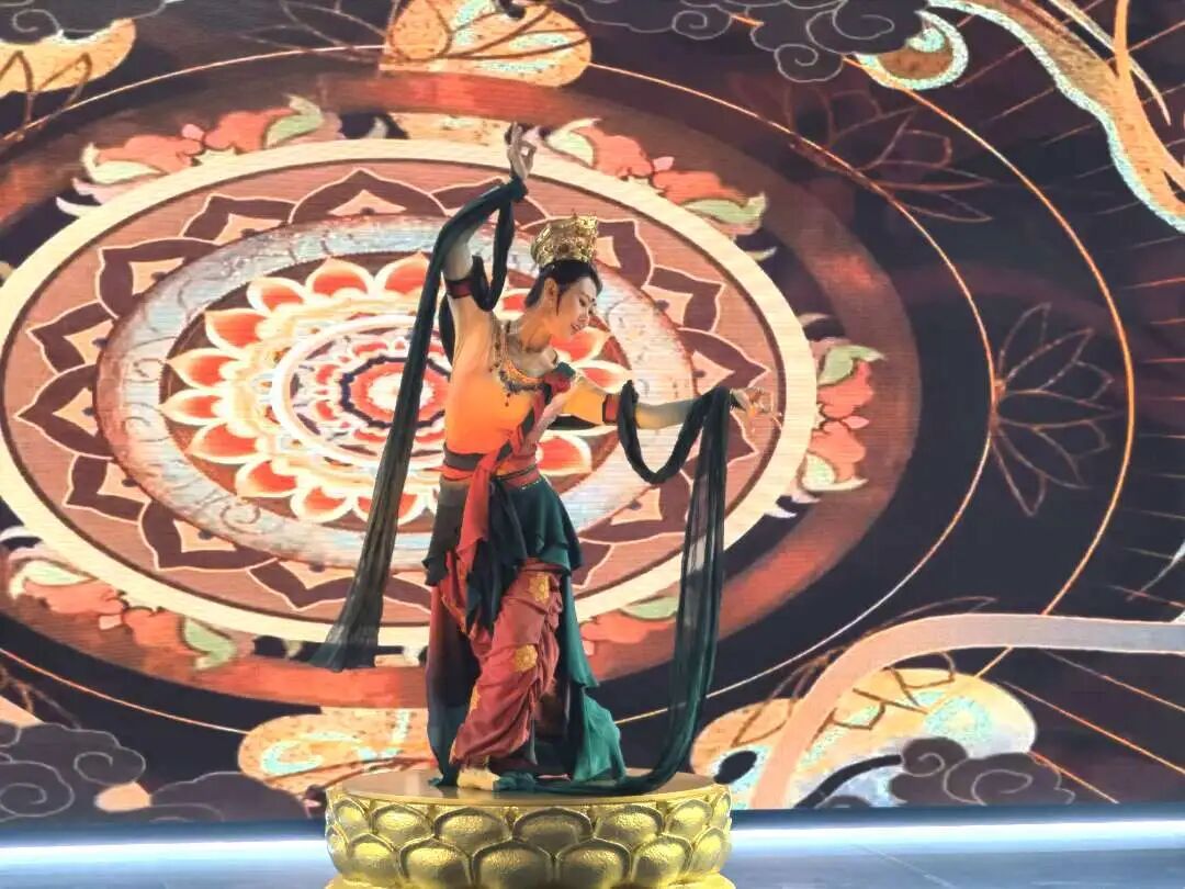 在山西馆门口,一场跨越千年的文化对话与艺术演绎十分吸引眼球。舞蹈《千年微笑》以大同华严寺薄伽教藏殿内的辽代合掌露齿菩萨彩塑为创作核心。作品源于创作者对这尊“辽代艺术瑰宝”的深度震撼——从菩萨合掌的姿态、露齿的浅笑到衣袂的纹理中汲取灵感,通过舞蹈语言将静态彩塑转化为灵动的肢体表达,让千年之前的工匠巧思与审美意趣在当代舞台重生。