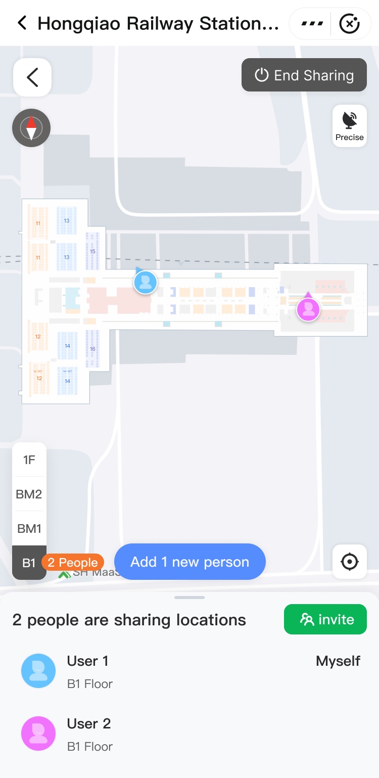 Share location: Share a link with your companions to see each other's live location on the map, a feature that works across different floors (supports up to 5 people). You can also manually select a meeting point, send the location, and follow the navigation to meet up.