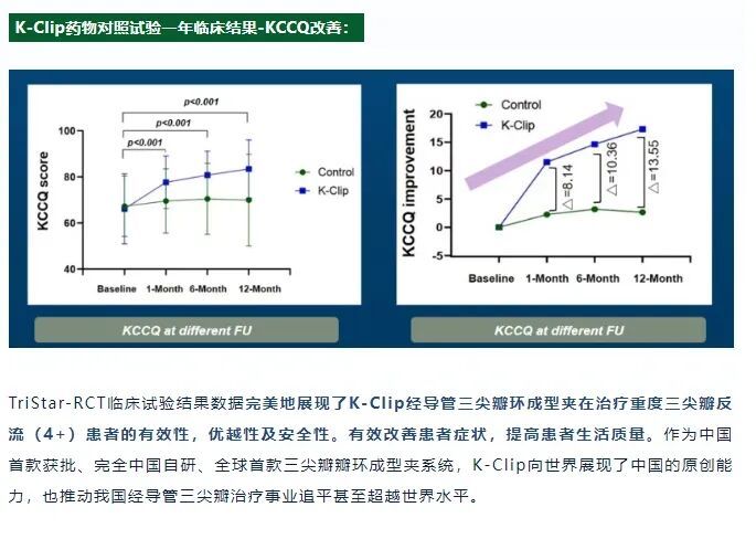 相较之前TriStar单臂临床试验,公布结果更直观地展示了K-Clip经导管三尖瓣环成型夹系统治疗重度TR患者的有效性,安全性及优越性。TriStar-RCT临床试验结果数据还展现了K-Clip经导管三尖瓣环成型夹在治疗重度三尖瓣反流(4+)患者的效果,能有效改善患者症状,提高患者生活质量。