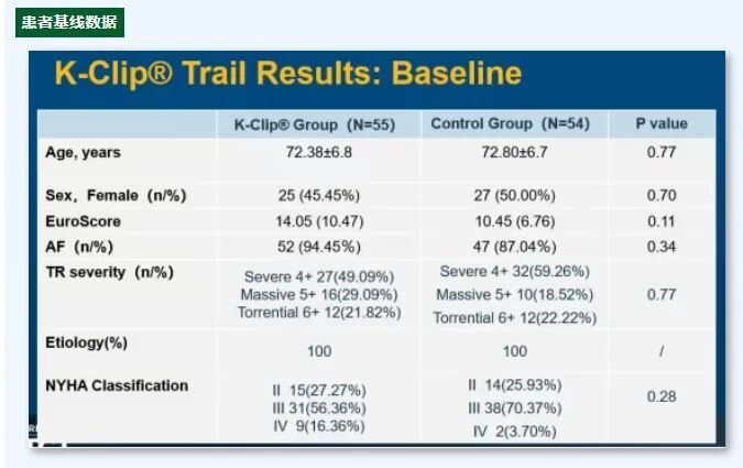 这项名为TriStar-RCT的临床试验是中国介入瓣膜类产品的第一个前瞻性、多中心、随机药物对照研究,共纳入109例患者(K-Clip Group: N=55 Control Group: N=54),所有患者均为症状性重度及以上的三尖瓣反流(TR≥4+ 2023经导管治疗三尖瓣反流中国超声专家共识)患者。一年随访结果显示,K-Clip®试验组对比药物治疗对照组,在三尖瓣反流的改善、生活质量的提升以及患者术后心衰再住院率等方面都显著优越。
