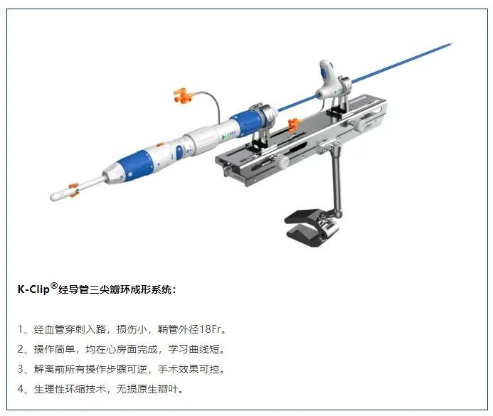 据了解,K-Clip®经导管三尖瓣环成形系统具有显著技术特点:经血管穿刺入路,损伤小,鞘管外径仅18Fr;操作简单,均在心房面完成,学习曲线短;解离前所有操作步骤可逆,手术效果可控;采用生理性环缩技术,无损原生瓣叶。