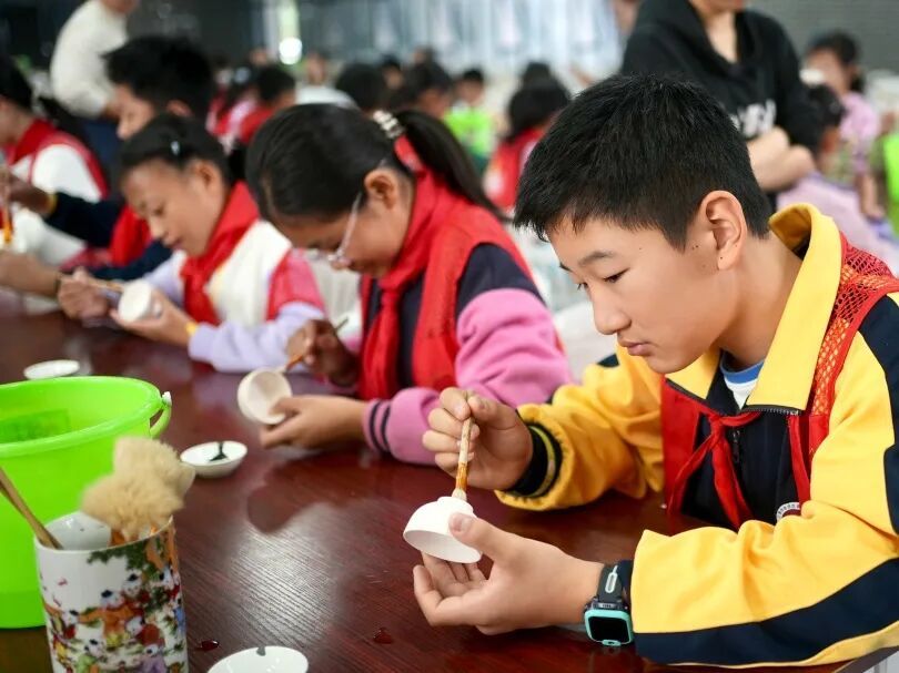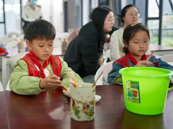 在素杯作画区,老师示范青花料调配、勾线与分水技法,少年依次执笔,在杯壁勾勒缠枝莲、山水或卡通图案;线条粗细、钴料浓淡、留白位置均需自行把握,每一步都是考验耐心与稳定性。