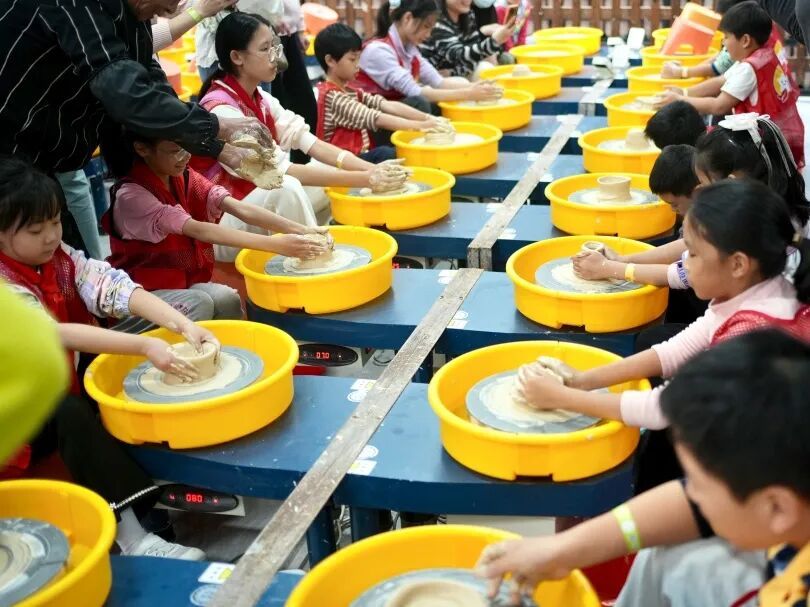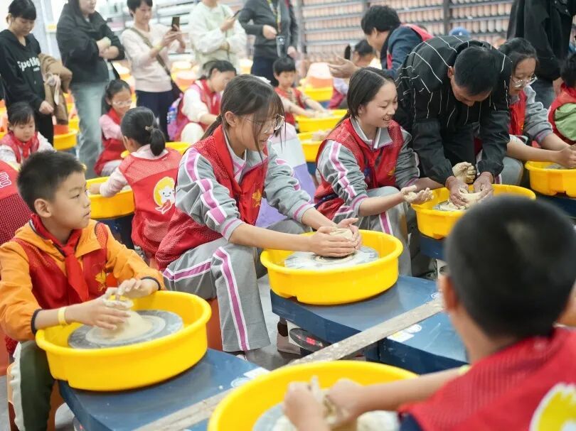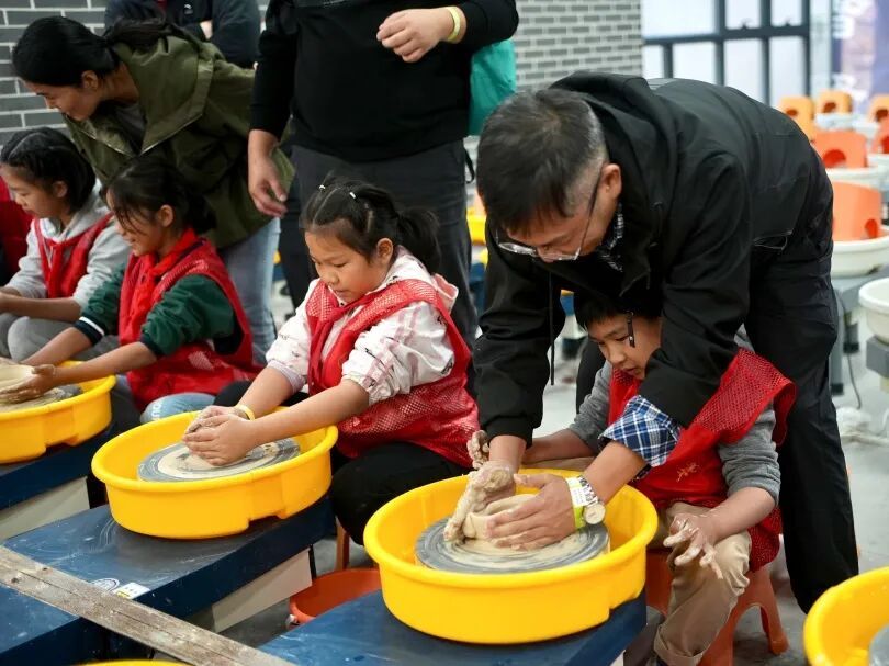 在拉坯体验区,少年们在老师指导下依次启动转盘、定中心、开洞、拉高,湿泥受力不均容易偏移,需实时调整手速与角度。现场操作声、提示声、交流声交织,学习氛围集中而活跃。