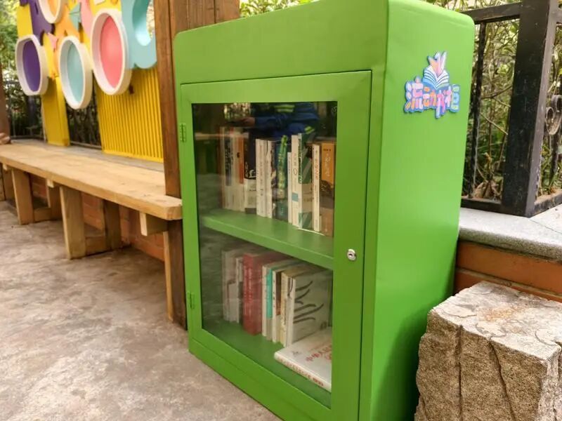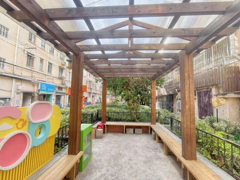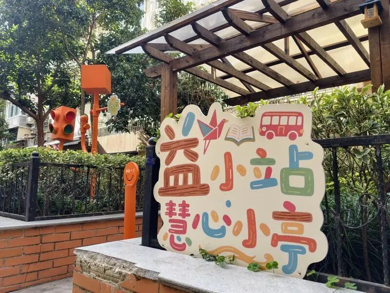 改造后的“慧心小亭”令人眼前一亮:原木色廊架配上透明棚顶,既通透明亮又能遮风挡雨;木质长椅成为家长等候孩子、居民闲聊的好去处;绿色流动书柜里陈列着学生捐赠的书籍,成为社校文化交融的微空间。