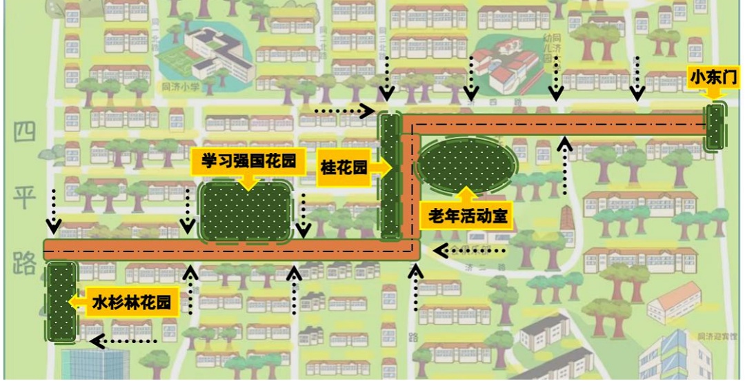 民意所向,就是党组织工作的方向。在了解到居民的诉求后,居民区党总支以服务群众经费立项为契机,将出行便利的“点”与社区空间品质的“面”结合,正式推出“红韵连心轴”项目,明确修整路面与改造桂花园为核心任务,注重安全、包容与实用。