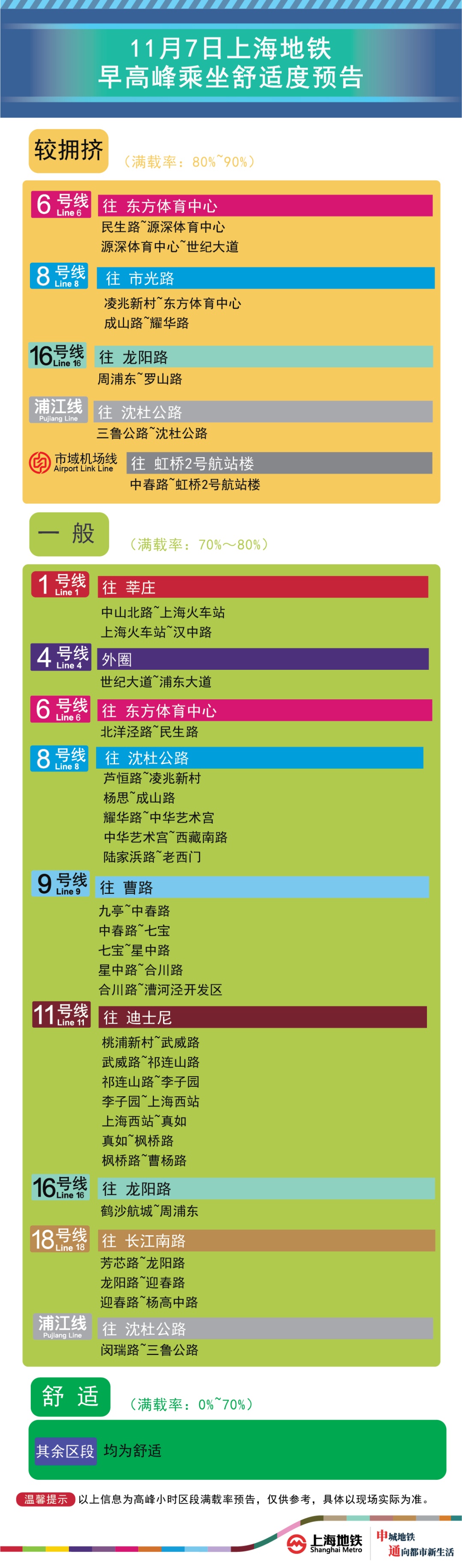 为提升上海地铁早高峰期间出行服务水平,提升乘客乘坐体验,上海地铁向乘客提供乘坐舒适度预告,方便乘客提前做好出行准备。