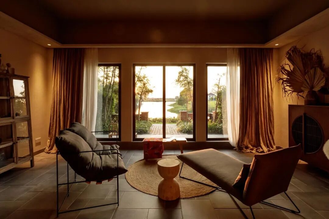 2、上海画一养生度假村:度假村坐落淀山湖畔,三面环水、稻田环抱。客房细节彰显设计师品位,家具艺术品等从法国精心收集,气质高雅,既有原生态温柔,又体现低调奢华,更与周边水乡古镇的年代感、稻田的生机巧妙呼应。餐厅选用自种及周边食材,主打淀山湖河鲜,致力于呈现最原汁原味的农家菜,带领食客们体验水乡美食的质朴与健康。