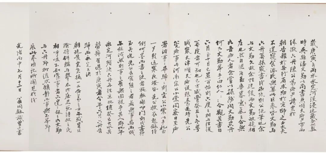 这幅手卷中有潘祖荫致陈彝的信札数十封,信中所述皆与光绪十六年近畿水患赈灾之事相关。这幅长卷,所录皆为潘祖荫就此水患赈灾筹措诸事给陈去信,详细记载了请拨粮饷、募捐筹款、安置灾民等各项事务,是研究晚清赈灾制度的第一手史料,具有极高的文献价值。