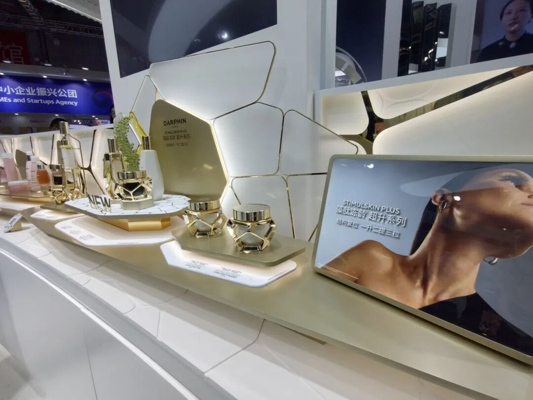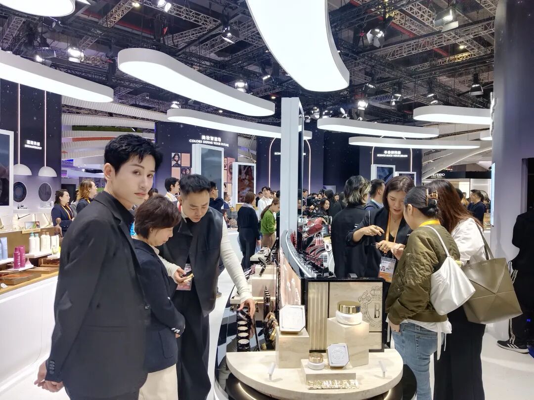 走近展台,一座流线型结构与梦幻光影交融的美学殿堂扑面而来,光影在弧形穹顶上游走,既不失优雅又有满满的科技感。有的观众在护肤品展位停留,有的直奔美妆展位,有的则细嗅香水的气味,还有的围拢在活动区域听取专业介绍。