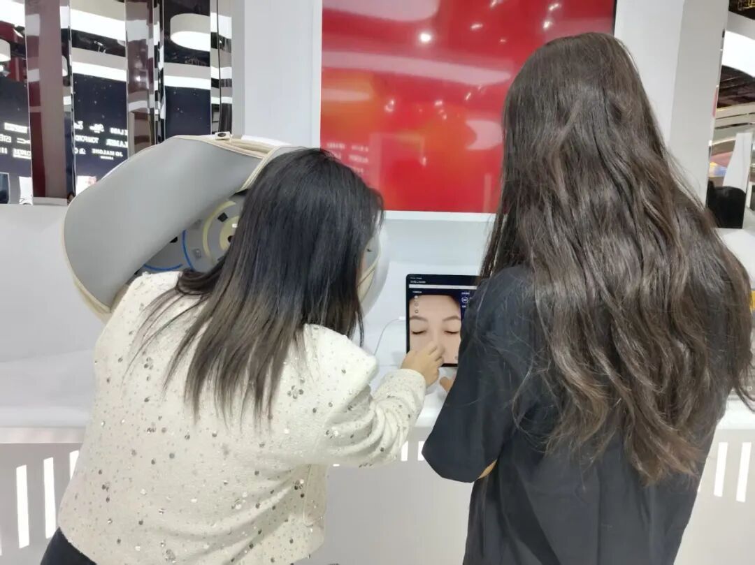 作为最早深耕长寿科学研究的国际美妆集团之一,雅诗兰黛集团带来了定制开发的AI智能肌肤检测仪,为参观者提供一次简易快速了解自身肌肤状态的机会。只需几十秒,体验者就可获得一份自己能够读懂的肌肤“体检报告”,直观了解自身“肌龄”。不少观众是第一次体验,有的体验后拿起手机拍下测试结果。“看来我平时要多补水了。”一位女士读完测试报告后说道。据了解,这台仪器将逐步应用到雅诗兰黛等品牌的线下柜台。