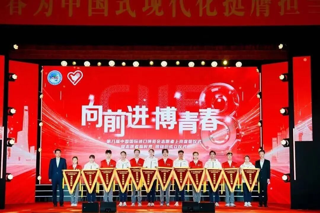 10月29日,第八届中国国际进口博览会志愿者上岗宣誓仪式暨志愿者临时党、团组织成立仪式在上海展览中心友谊会堂举行。志愿者们以铿锵誓言宣誓上岗,期待用温暖的笑容与优质的服务,让“奉献、友爱、互助、进步”的志愿精神落地生花。上海大学“小叶子”们作为本届进博会党、团员先锋岗志愿者代表,郑重接过先锋岗旗帜,扛起志愿者的责任与使命。