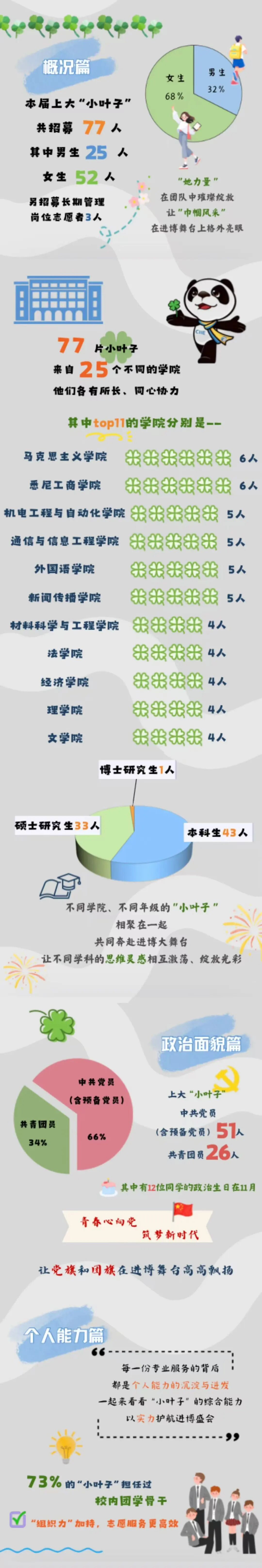 青春集结,百花齐放。第八届上大“小叶子”共77人,另有3名长期管理岗位志愿者,6名同学担任中国馆讲解员,化身进博故事的“讲述者”。