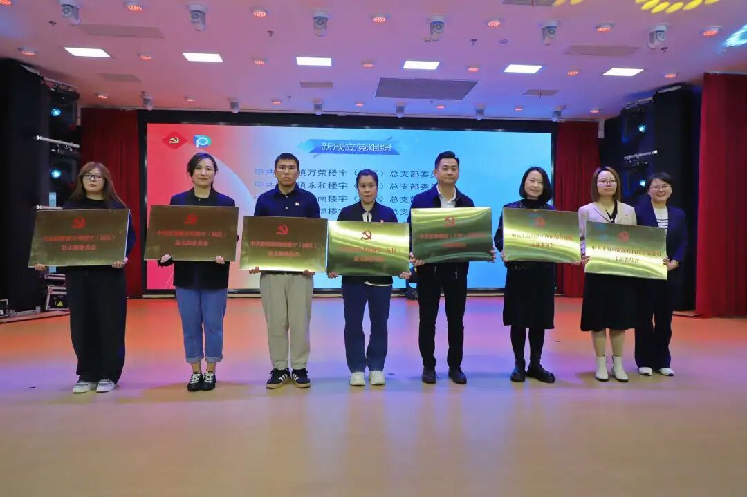 在“聚心——党建凝魂”环节,动画演示生动展现了基层党组织网络在居民区、街区、楼宇园区的全面覆盖。活动中,中共彭浦镇万荣楼宇(园区)总支部委员会、中共彭浦镇永和楼宇(园区)总支部委员会、中共彭浦镇塘南楼宇(园区)总支部委员会、中共彭浦镇幸福楼宇(园区)总支部委员会等7个最新成立的党组织代表上台接受授牌,标志着彭浦镇党建工作迈入新阶段。