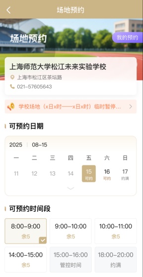 此前,松江70余所中小学校已经实现校内运动场地免费对外开放,市民只需通过“随申办·松江旗舰店”就可根据情况预约场地。但因限于部分学校场地情况特殊,开放时间变动较为频繁,影响市民预约体验。近期,松江区数据局联合区教育局通过随申码平台,新升级了学校场地预约管理系统,同时优化了服务预约机制。