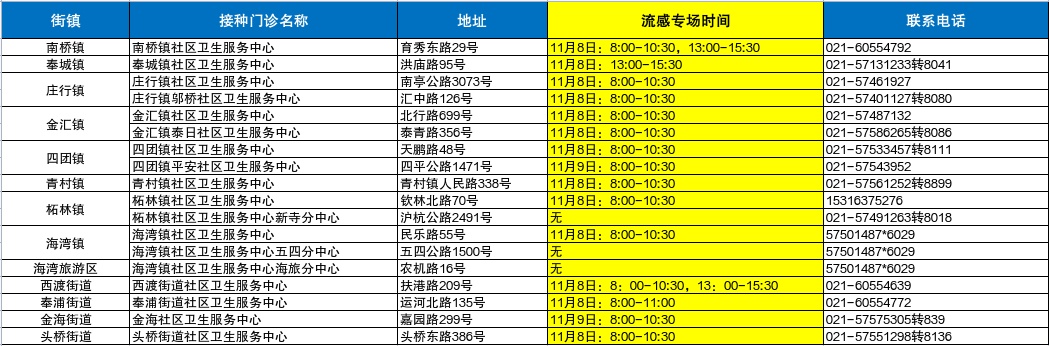流感疫苗 接种专场 接种流感疫苗,是预防流感最经济、最有效的手段,最好在流感流行季来临前完成接种。在这气温多变的季节里,接种流感疫苗,就是筑起的一道健康防线。11月8日~9日,奉贤区特开设周末流感疫苗接种专场! 流感疫苗专场安排 预约流程 为什么要接种流感疫苗? 流感不是普通感冒,是由流感病毒引起的一种急性呼吸道传染病。据世界卫生组织估计,流感每年在全球可导致300万~500万重症病例,29万~65万呼吸道疾病相关死亡。接种流感疫苗是预防流感、减少流感相关重症和死亡的有效手段。 流感疫苗的最佳接种时间? 通常接种流感疫苗2~4周后,可产生具有保护水平的抗体。 由于我国各地每年流感活动高峰出现的时间和持续时间不同,建议受种者在流感流行季来临前一个月接种流感疫苗。若在流行季来临前未完成接种,整个流行季都可以接种。 哪些人群需要接种流感疫苗? ≥6月龄且无接种禁忌的人都应接种流感疫苗。 结合流感疫情形势和多病共防的防控策略,尽可能降低流感的危害,优先推荐以下重点和高风险人群接种: 1