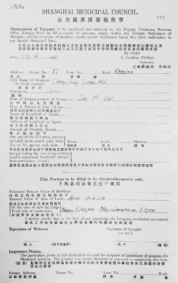 上图为 1940年公共租界房客报告单