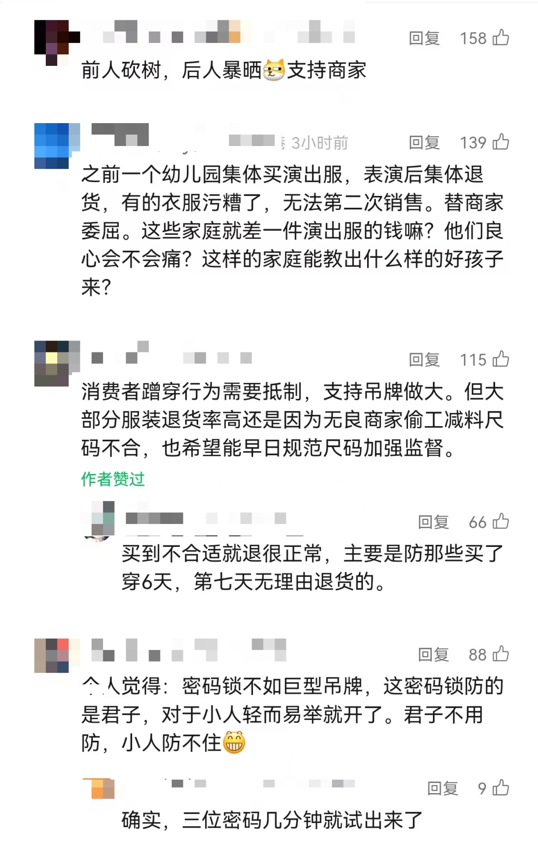 还有一位售卖羽绒服等冬衣的商家,为防止部分顾客利用平台政策“蹭穿”衣服,无奈之下选择在衣服拉链上,挂一把显眼的三位数密码锁。该商家表示,密码锁挂在拉链上不影响试穿,如果顾客确认收货,顾客联系他后会告知密码,锁就直接送给客人了。