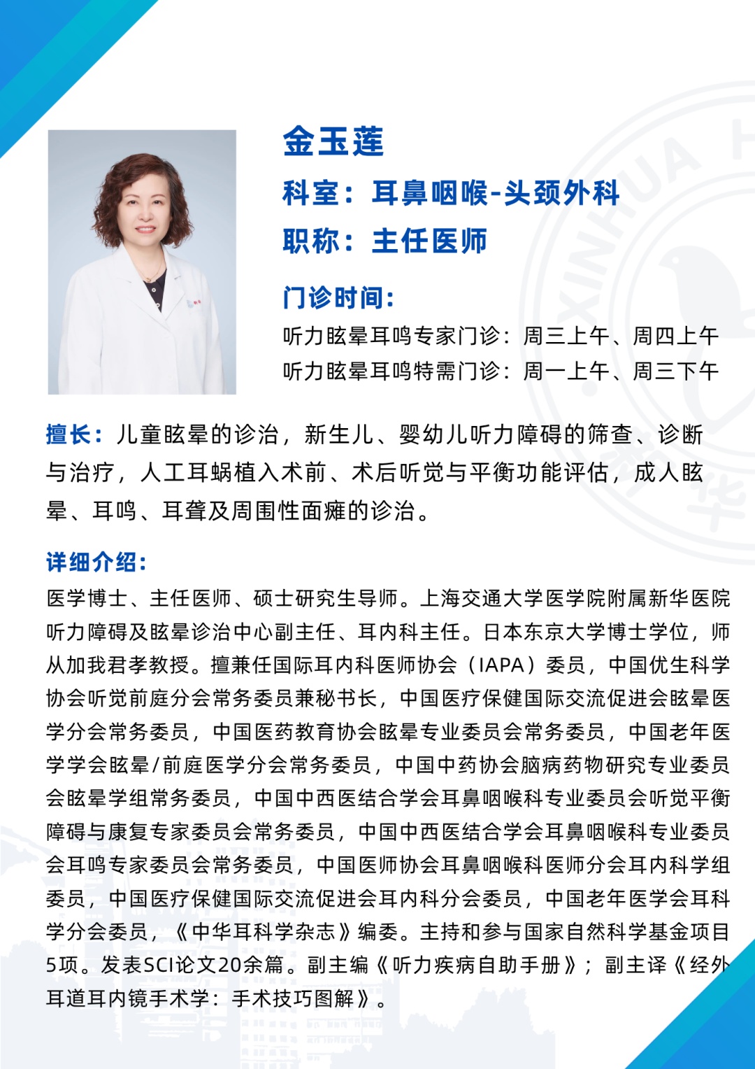 上海交通大学医学院附属新华医院听力障碍及眩晕诊治中心是上海市儿童听力障碍诊治中心、中残联及上海市人工耳蜗植入基地、卫健委新生儿听力筛查培训基地、卫健委助听器验配师培训机构、国际听觉与平衡学院(上海站)、新华-渥太华听力言语障碍诊疗中心,是华东地区规模最大、技术最全面的听力障碍及眩晕诊治中心之一。中心拥有医师5名,其中主任医师3名、主治医师2名,博士4名、博导1名、硕导1名;还有9名技师,其中硕士3名。