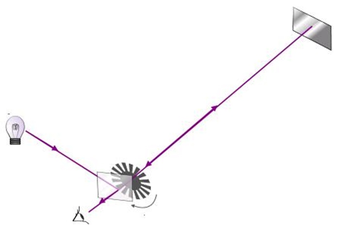 进入19世纪,法国物理学家阿曼达·斐索(Armand Fizeau)采用了更为精密的方法——旋转齿轮法。做法是让光束通过高速旋转的带齿轮的遮板射向远处反射镜,再折返通过同一位置:当齿轮恰好在往返时间内由“缺口”转到“齿挡”,返程光就被挡住出现“熄灭”,据此可由已知的往返距离