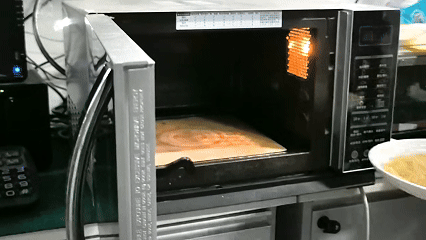 开始加热,大约等待几分钟。安全起见可分多次加热,间隔观察手抓饼是否出现焦斑,但是间隔中一定不能移动手抓饼位置。