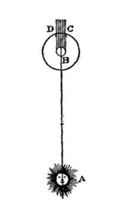 罗默绘制的示意图,其中A为太阳,B为木星,小圆是木卫一的轨道。当木卫一位于CD阴影之间时,发生木卫一蚀。
