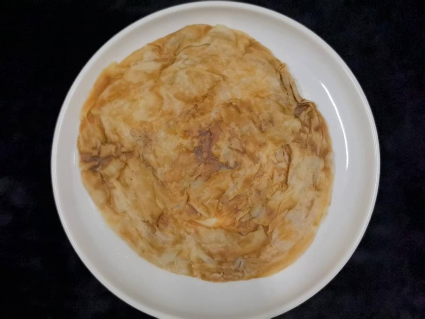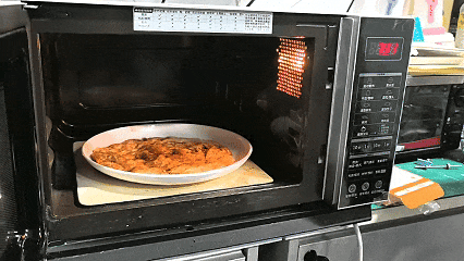 先把微波炉里的转盘取出来(关键!),将手抓饼平铺在盘子上,放进微波炉。