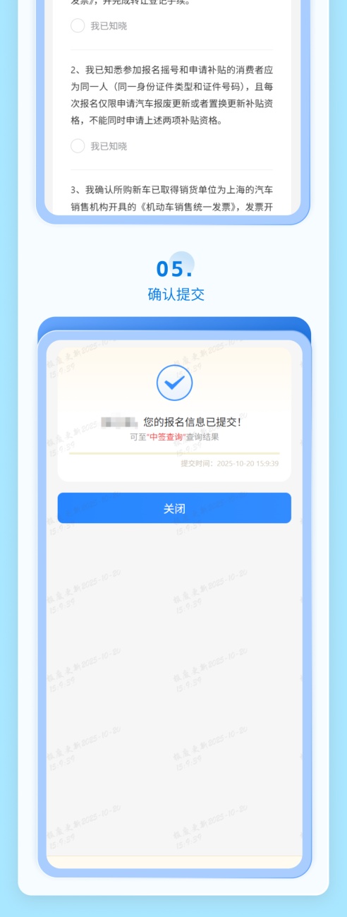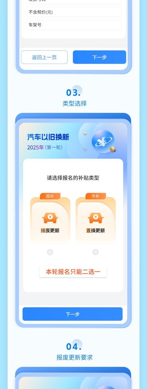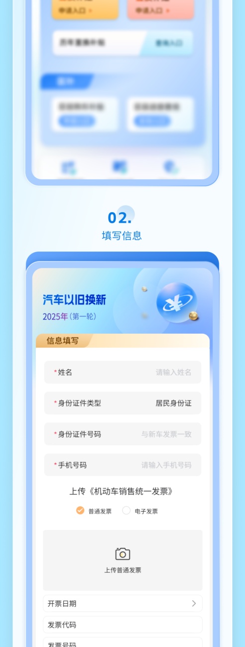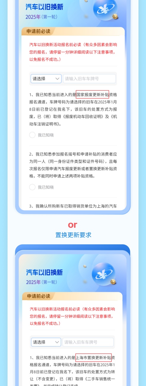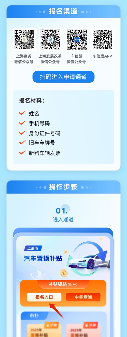 符合条件的个人消费者可在规定时间内通过“上海商务”微信公众号等平台,从“政务服务-汽车置换补贴申请-补贴资格”进入报名入口,并选择“报废更新”或“置换更新”参加报名。个人消费者报名时需填报并授权平台使用相关个人信息,包括姓名、手机号码、身份证件号码、旧车车牌号、新购车辆发票等信息。