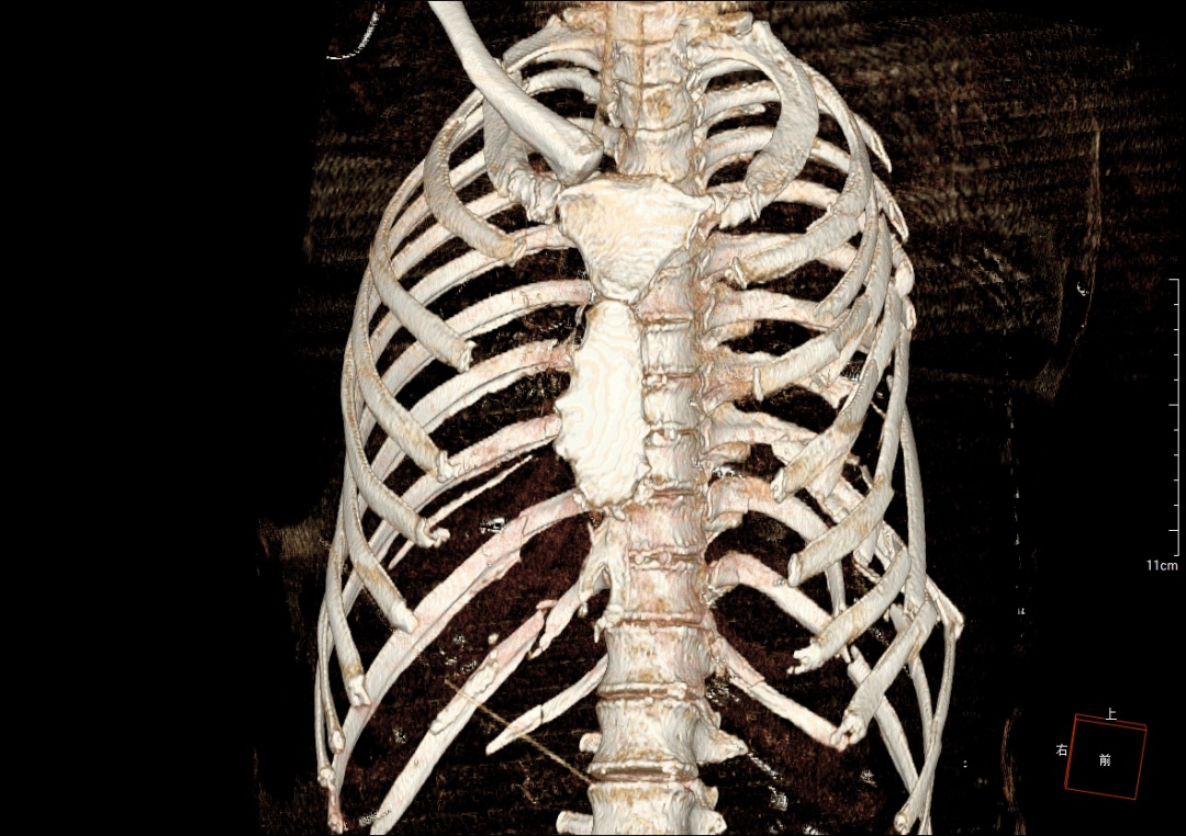 术前影像检查结果显示,陈女士的胸部因遭受剧烈挤压,导致胸壁严重软化塌陷,胸腔有大量积液。胸外科张己为医生介绍:“人体胸腔共有24根肋骨,患者断了20根,尤其左侧伤情最为严。”其中,第1至第12根肋骨全部骨折,左侧和右侧肋骨共有40多处断裂,骨折碎片像尖刀一样扎进肺里。