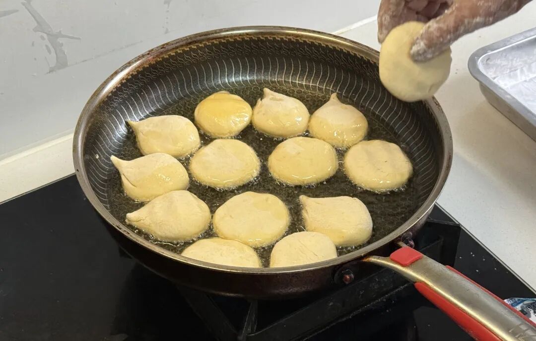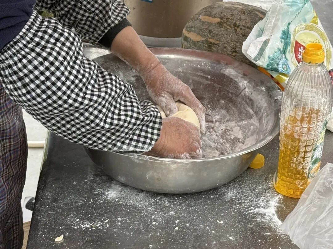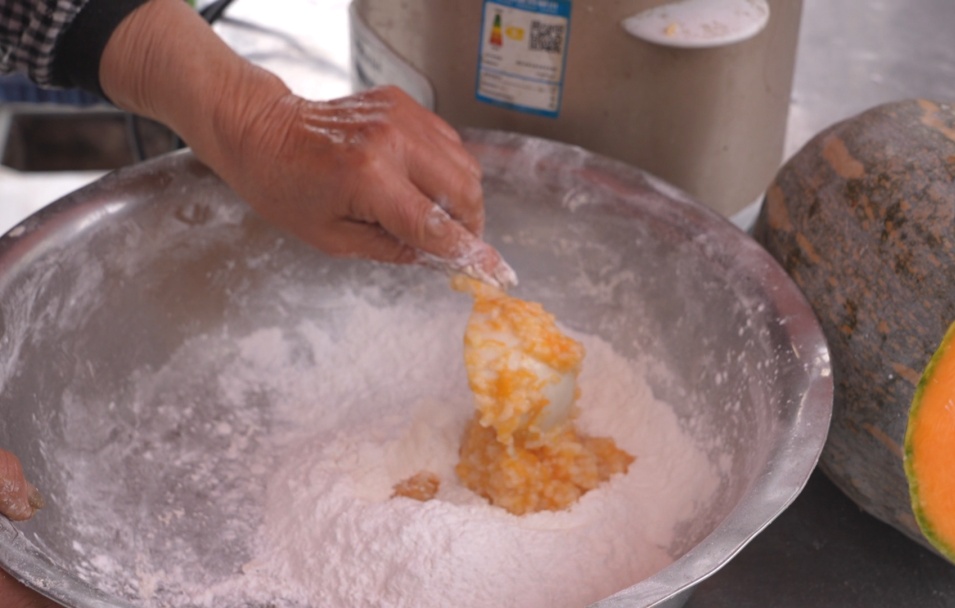 煮好的南瓜粥拌入糯米粉里反复揉搓成团,这一步就要看手感了,“糯米粉要少量多次加入,可以边揉边加,也可以加入少量玉米油”。她边说边把面团揪成小剂子,指尖一转就捏成了小碗状。