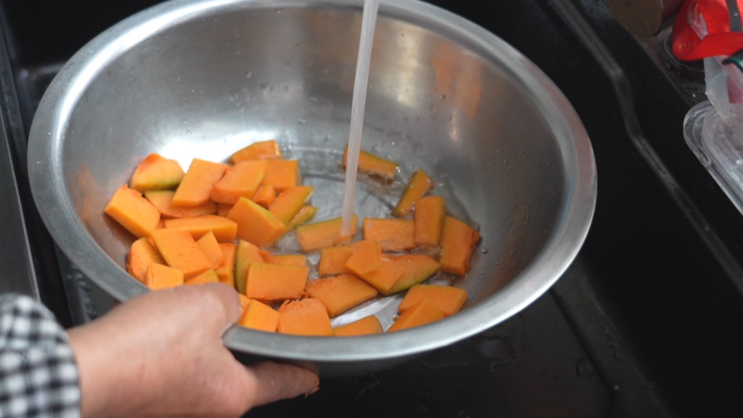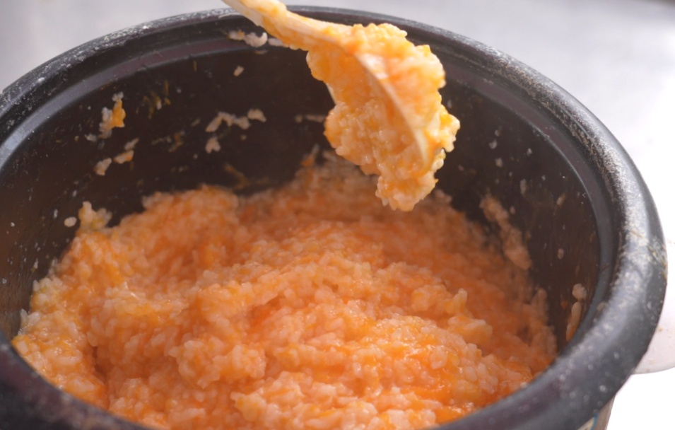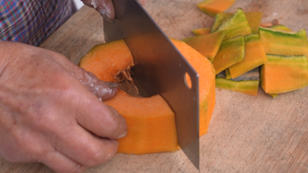 先将南瓜切片后洗净和糯米一起放入电饭锅中煮成南瓜粥。吴阿姨一边和糯米粉,一边说:“南瓜本身就甜丝丝的,糖都不用多放,吃的就是这本来的味道。”