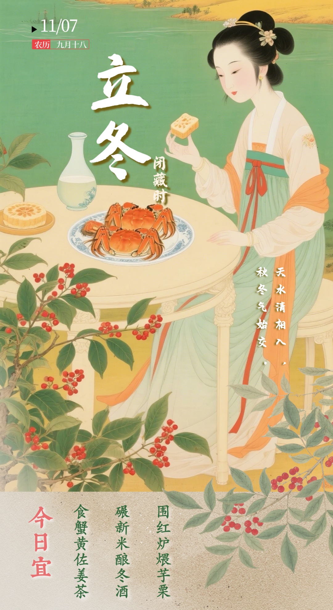 立冬,是一个由秋转冬的重要季节,古人认为,立冬是一个“由阳转阴”的节气,到了立冬时,阴气兴盛,阳气深藏,此时听任阴气统治地表,冰雪盛行,阳气则逐渐藏匿。正是在这种阴阳转化之中,阴气又在逐渐消耗,而阳气则在九地之深安静长养。