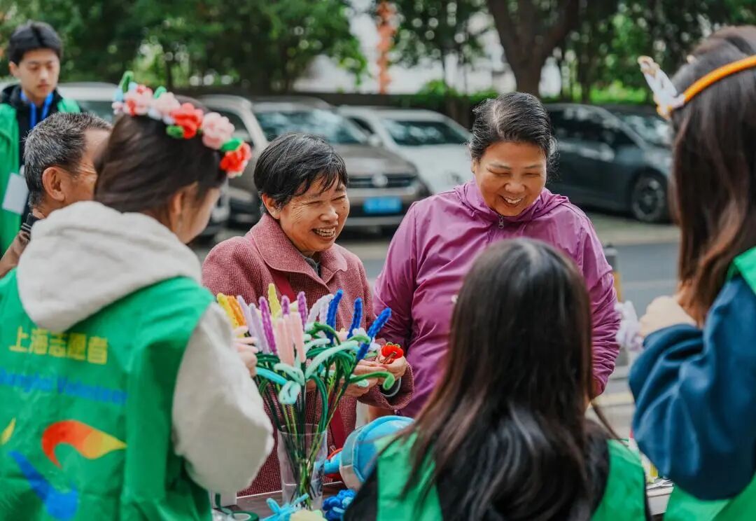 在“城·绿”扭趣魔法屋的摊位前,来自上海城建职业学院的同学们被团团围住,五颜六色的扭扭棒在他们指尖翻飞,很快绽放出花朵。“你看我的麦穗做得像不像?”一位阿姨兴奋地向同伴展示刚完成的作品,“这个不费眼睛,还能动动手!”