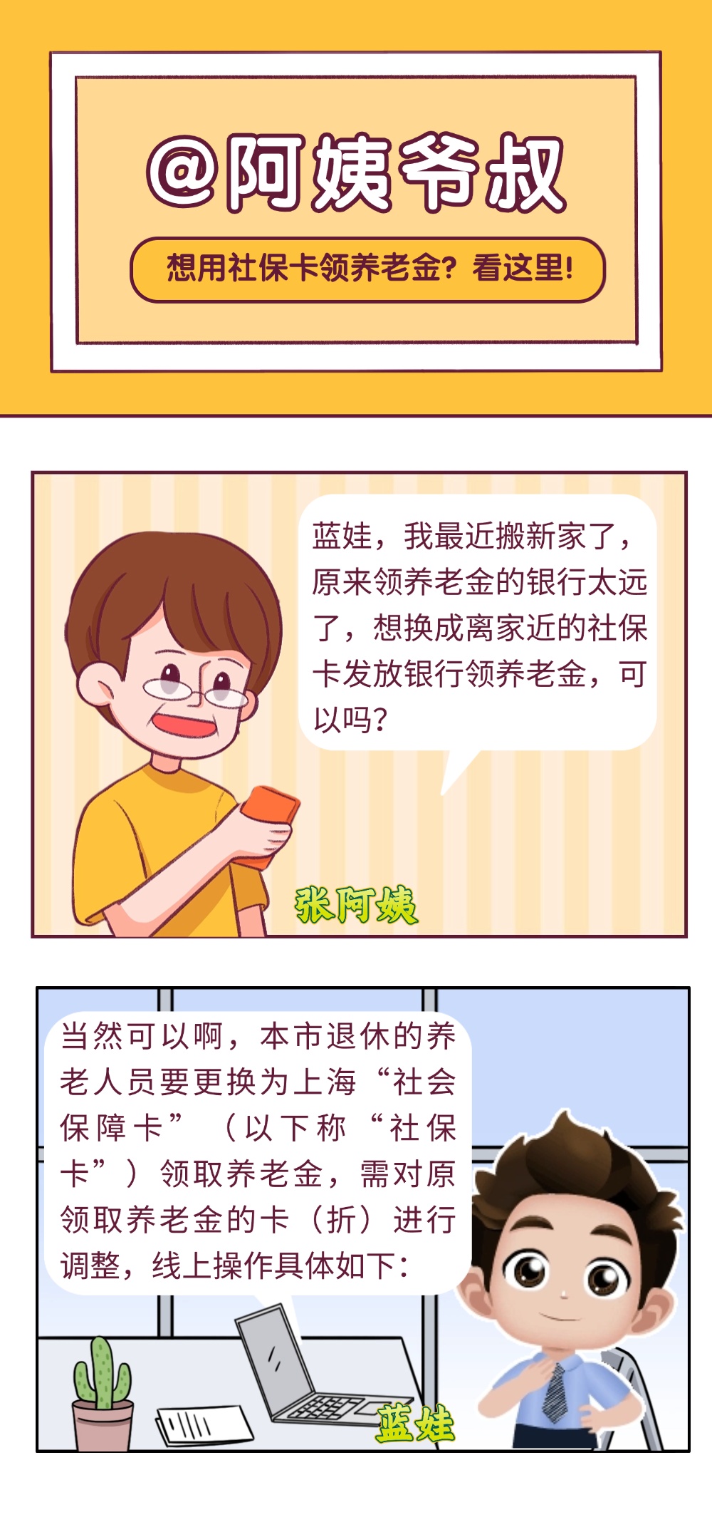 若因社保卡所属银行的服务网点较远或分布不均匀等原因,个人领取养老金不便的,可申请更换服务银行(即:社保卡金融账户所属银行)。待变更社保卡服务银行之后,再申请办理养老金卡(折)调整手续。