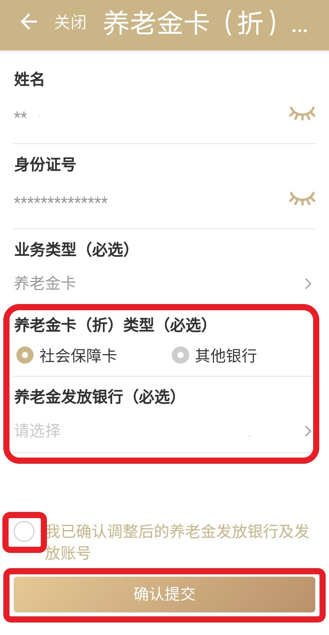 确认基本信息(姓名、身份证号)无误后,选择“养老金卡(折)类型(必选)” 为“社会保障卡”,并勾选“我已确认调整后的养老金发放银行及发放账号”后,点击“确认提交”,即可完成申请。