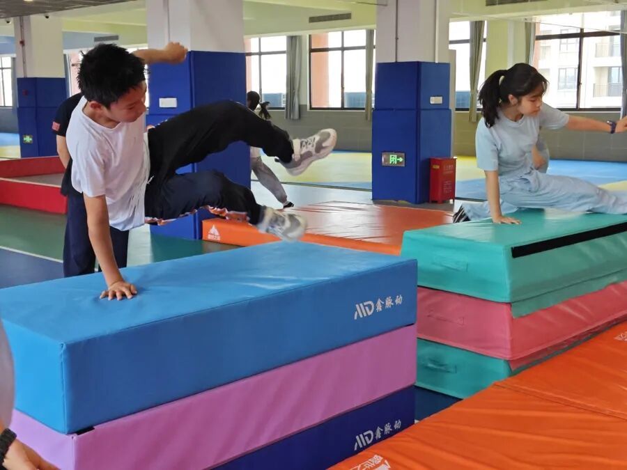 教学楼的五楼,有一片孩子们最喜欢的场地:一条特意为他们铺设的跑酷赛道。“以前带孩子尝试新事物,他总躲在我身后小声说‘我不行’。第一次送他去跑酷训练营,他就攥着我的衣角不肯松开,眼睛里满是怯意,我当时还担心他会直接放弃。现在,他通过跑酷训练,各方面变化太大了。”谈起跑酷社团,二(3)班的魏凡勋妈妈满是感慨。这项特色运动,如今已是学校体育教育的闪亮名片,更是孩子们锤炼体能、突破自我的重要平台。