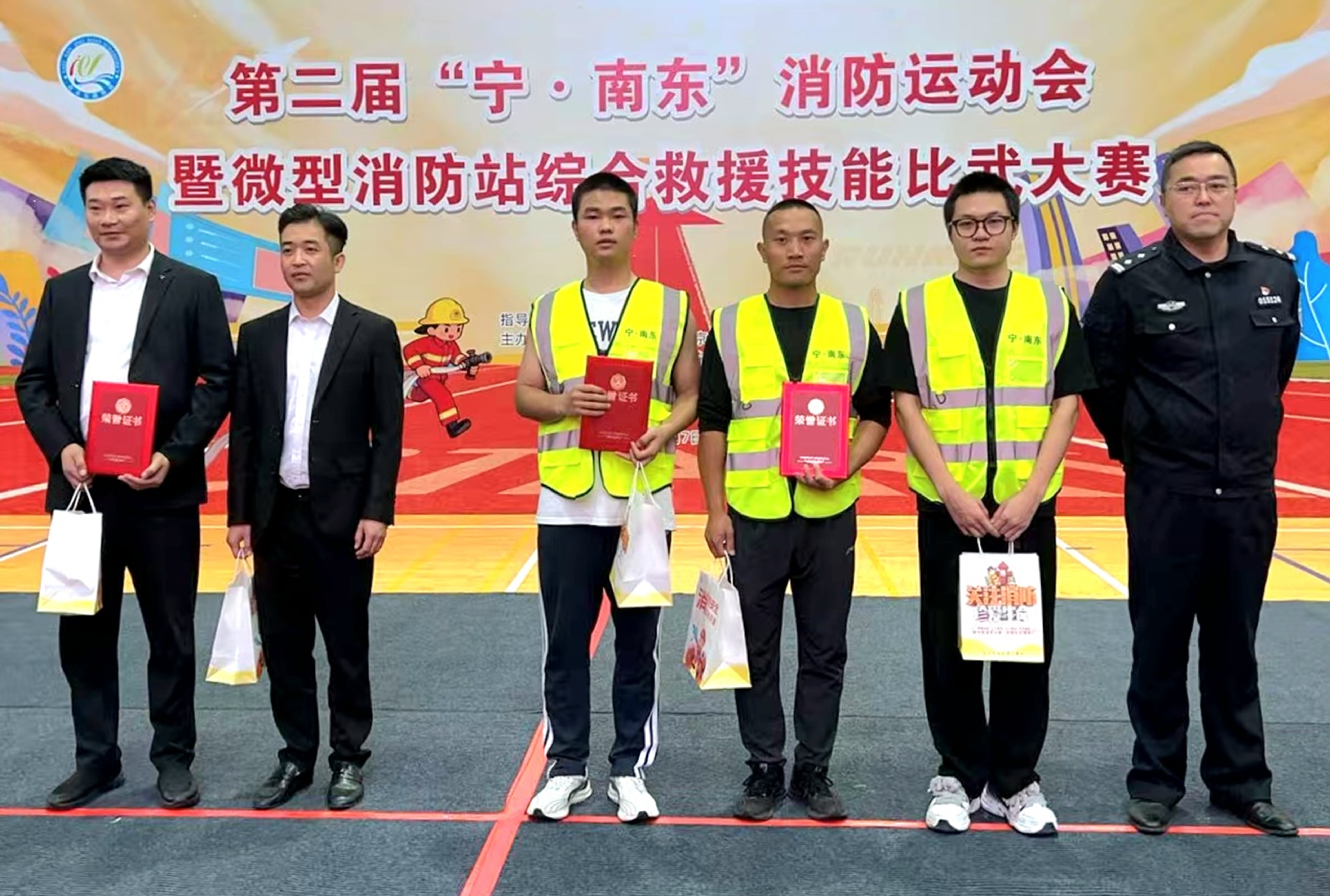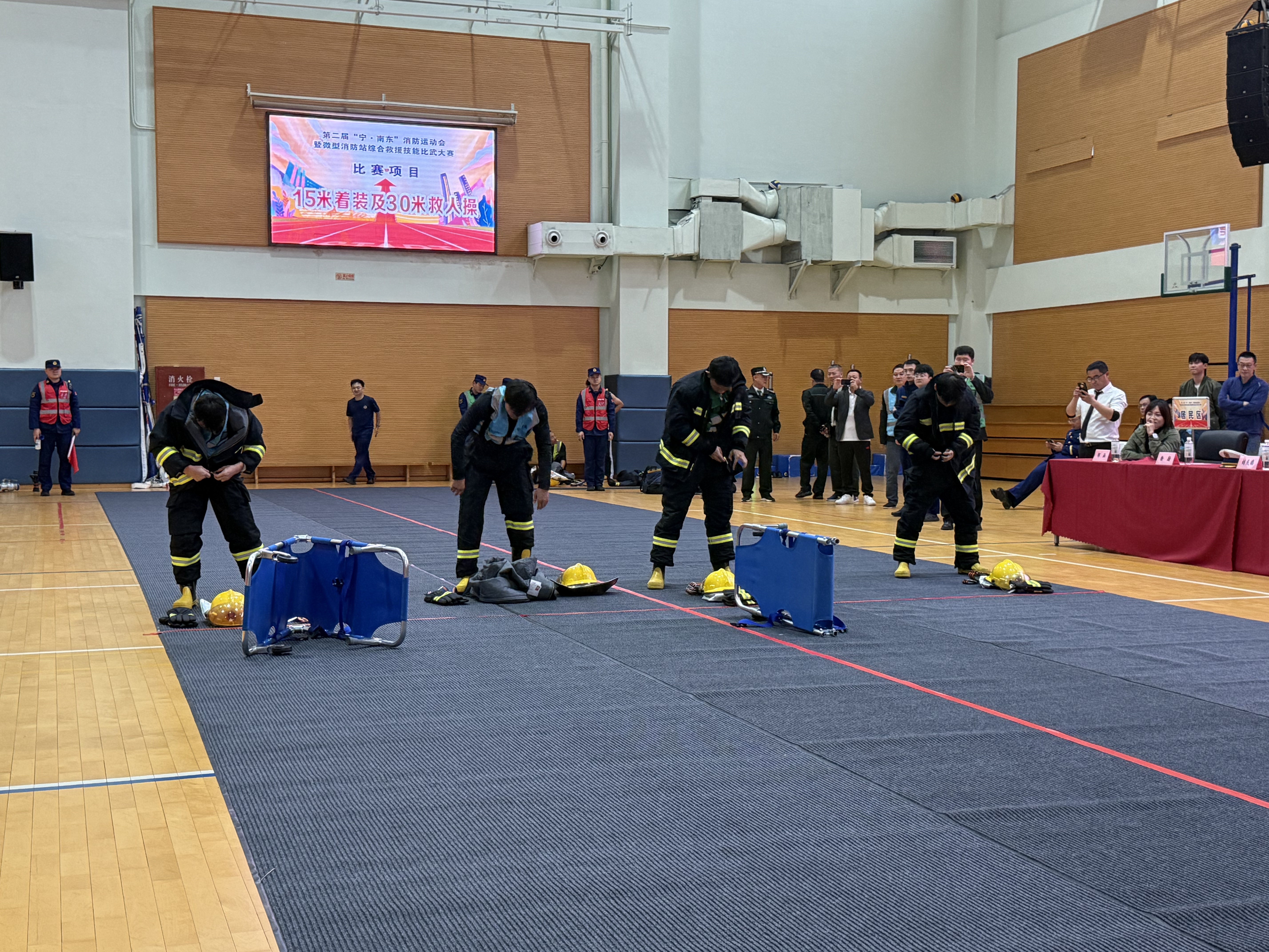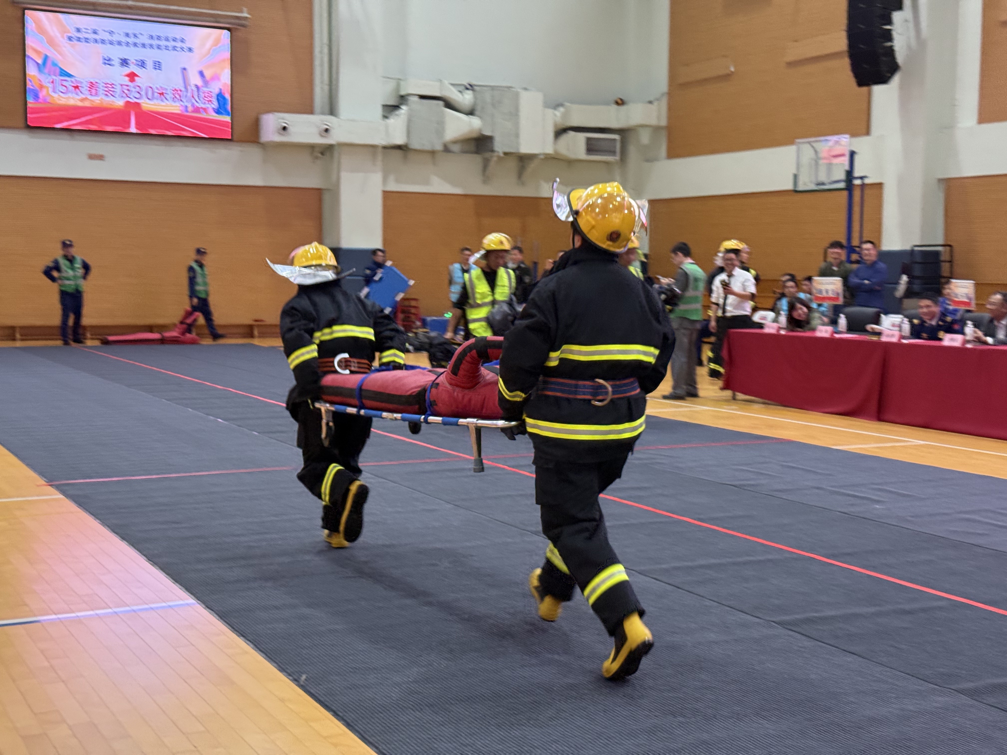 最为紧张激烈的当数15米着装接30米救人操(120斤假人)。这一项目不仅考验队员们的体能,更对他们的救援技巧和心理素质提出了极高要求。随着哨声响起,队员们迅速穿上厚重的消防装备,如离弦之箭般冲向“伤员”,将其安全救出。最终,新世界城代表队凭借出色的表现摘得第一名,来福士代表队和烟草大楼代表队分别获得第二、三名。此外,新世界城代表队还荣获最佳微型消防站团队称号。
