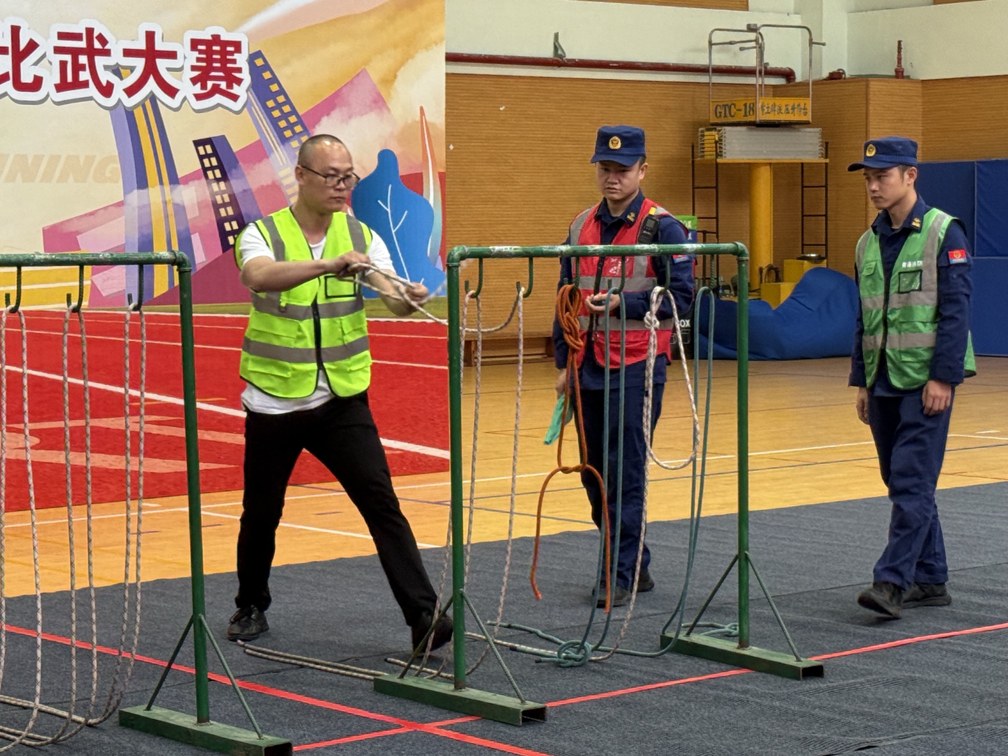 个人赛绳结操率先拉开帷幕。这一项目要求队员在短时间内精准、迅速地完成多种绳结的系法,每一个绳结都关乎着后续救援工作的成败。赛场上,队员们全神贯注,手指在绳索间灵活穿梭,展现出了扎实的专业技能。最终,烟草大楼代表队凭借出色的发挥夺得第一名,新世界城代表队和天安中心代表队分获二、三名。