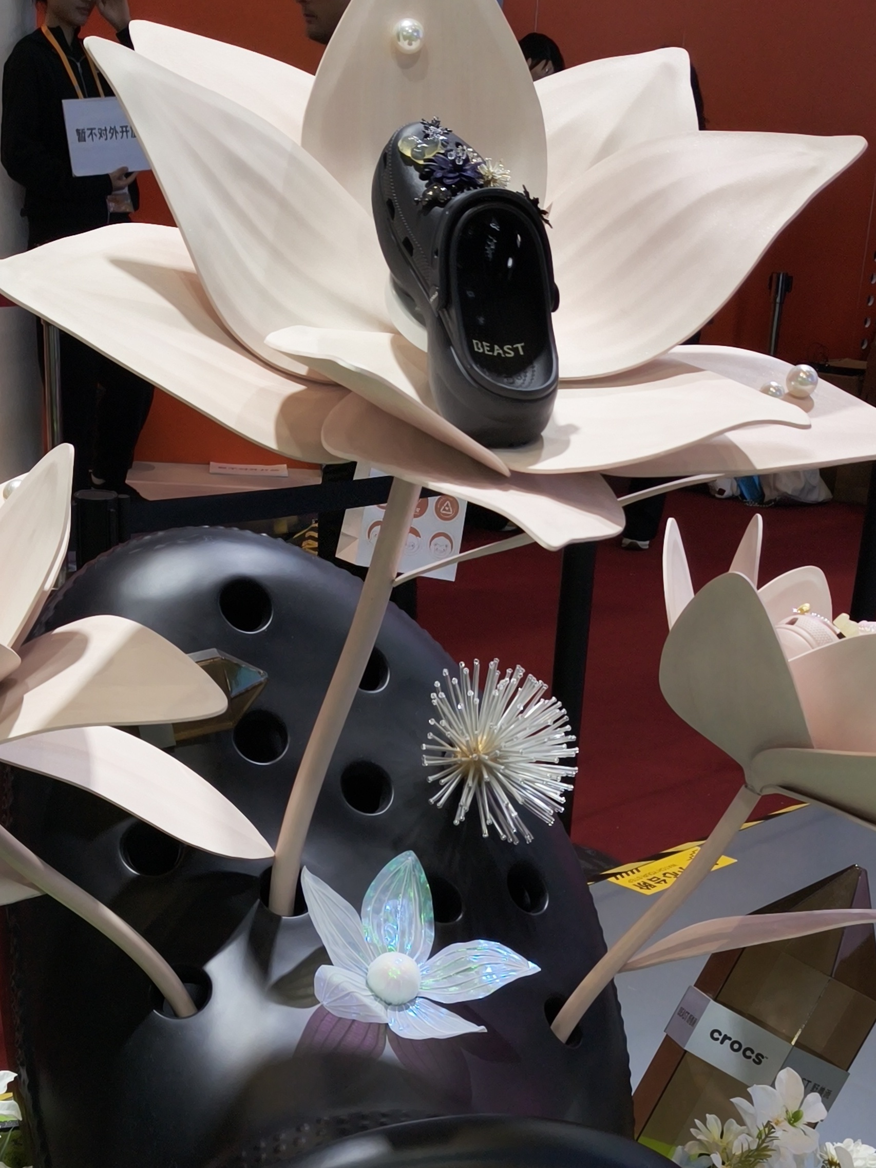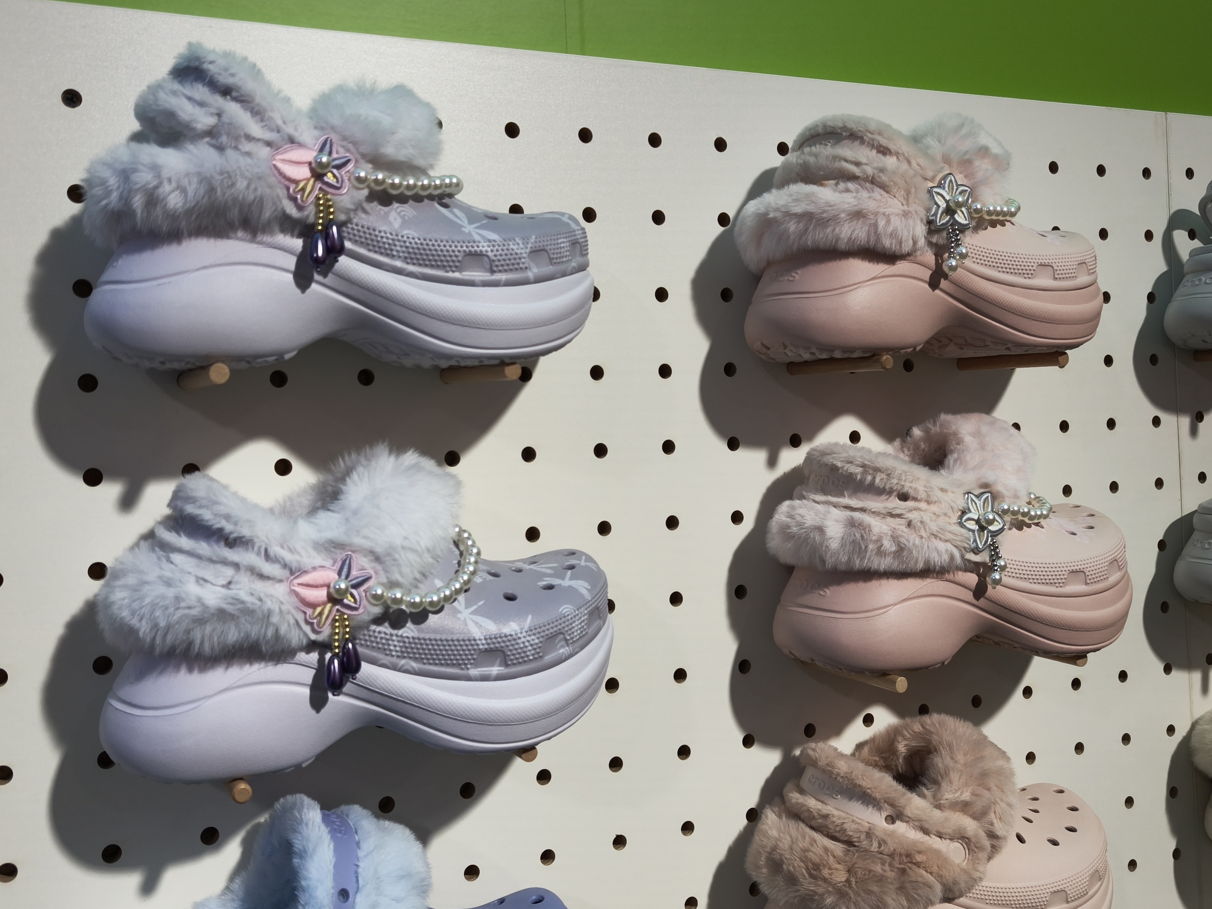 在中国,Crocs卡骆驰显然读懂了本土消费者的心。在展陈墙上,“梨花月”与“梅花雪”限定款,将“新中式”美学演绎得淋漓尽致,成为焦点之一。