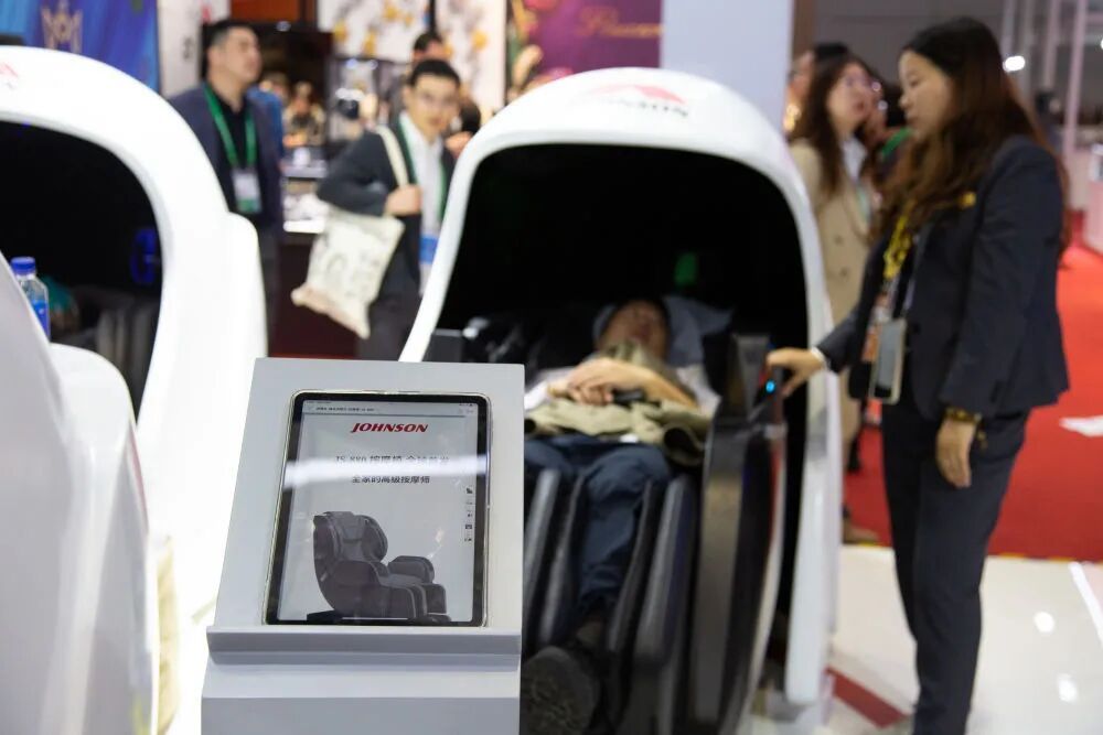 11月6日,在进博会消费品展区乔山健康科技展台,参观者体验该品牌全球首发的按摩椅。新华社记者 田薇薇 摄