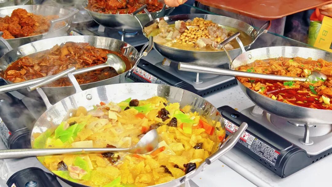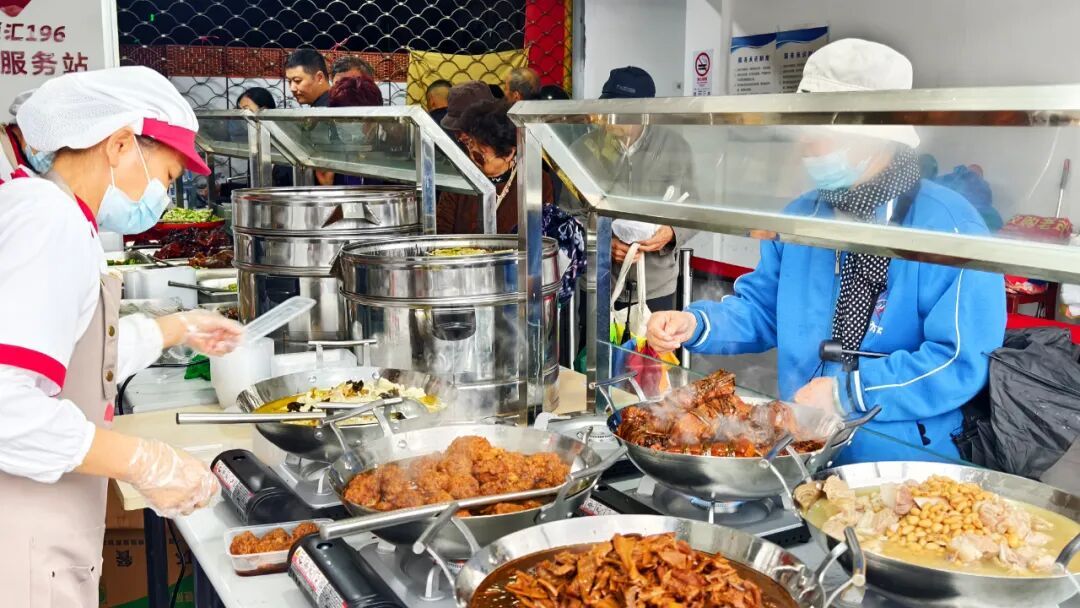 这几日的阴雨带来一些凉意,而在岳阳街道社区食堂外摆菜档口尤为引人注目。牛腩、猪脚、排骨等各式大锅菜在小火的慢煨中“咕嘟”作响,蒸笼里整齐码放着各式小菜,与一旁荤素搭配的十余种时鲜佳肴共同构成了诱人的选择,让过往居民纷纷驻足。