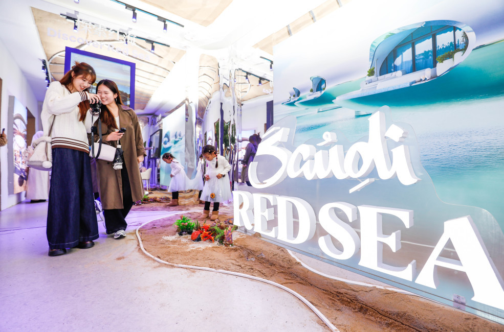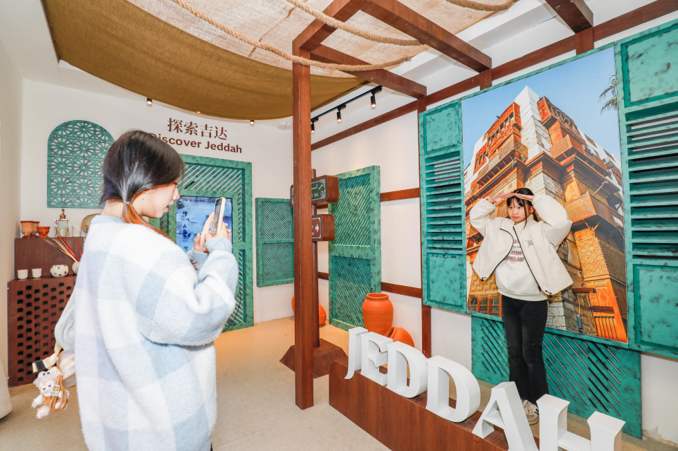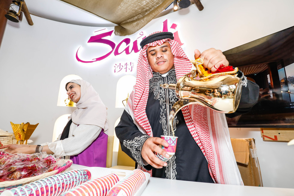 游客可在此换上沙特传统袍服,佩戴头巾拍照留念;也可参与文化工坊,体验阿拉伯书法、陶艺与椰叶编织,亲手制作独具特色的手工艺品。此外,展区还设有以利雅得、德拉伊耶、吉达、红海和埃尔奥拉五大目的地为灵感的多媒体互动区,通过影像与科技,生动展现沙特各地的自然风光与人文活力。