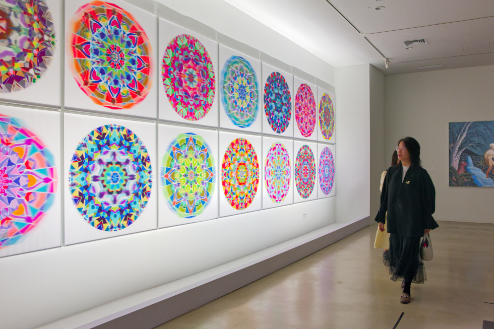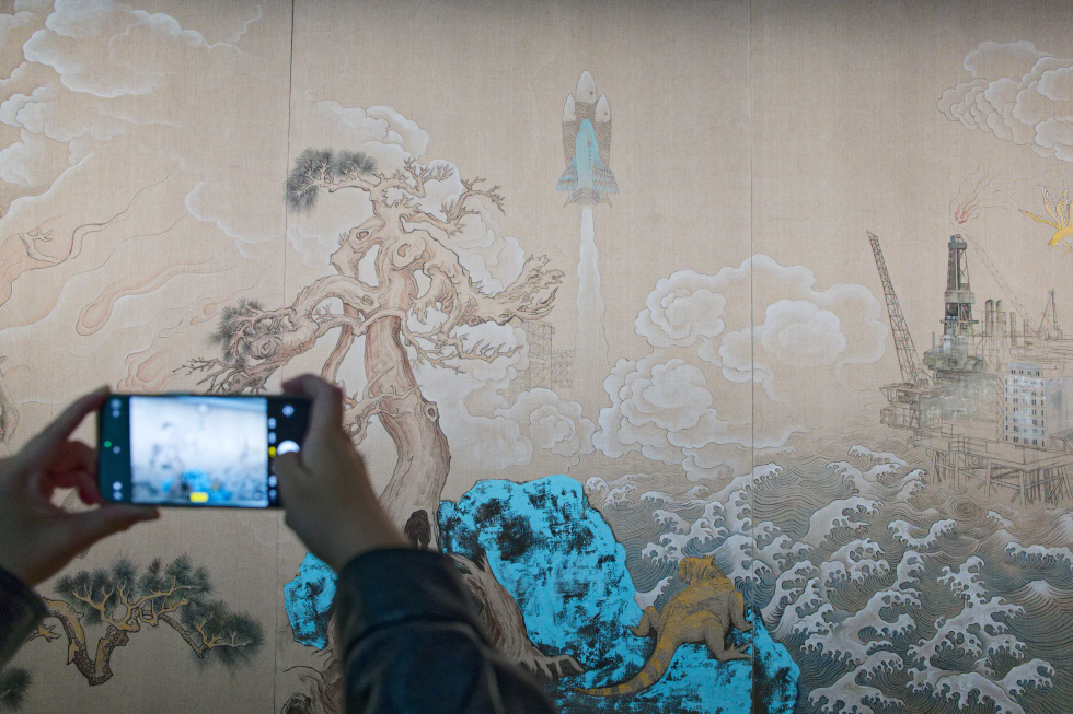 飞鸟变成了直升飞机,三条鱼组成了火箭,现代工业建筑如海市蜃楼一般浮在海上……艺术家邱岸雄在绘画作品《新山海经—神隐》中,描绘了一个现实与幻想交织的奇特世界,山川、异兽、机器与城市共生于一幅流动的史诗画卷中。“在《山海经》中,世界万物都是有生命的、连接在一起的。古人是在用一种原始、质朴的眼光来看世界。”邱岸雄说,“《新山海经》表达了我对当代人与自然关系的一种反思。”