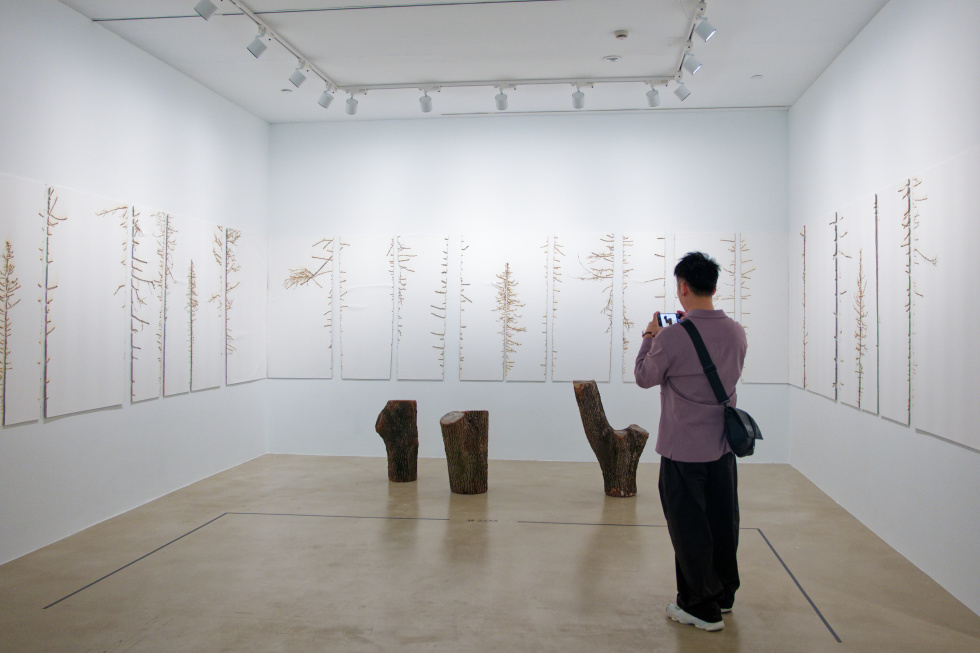 “我来自智利,在我创作这件作品的2017年,智利发生了最严重的森林火灾。”艺术家罗德里戈·阿尔特加在其作品《缺席的森林》中,以烧焦的痕迹与“留白”的树木轮廓,表现了这场令他难忘的灾难。这件作品还以纸张记录植物形态的转化,而树桩装置则指向被切割的生态记忆。罗德里戈说:“这是对树木的纪念,也促使我们‘重建’一种更加伟大的生活方式。”