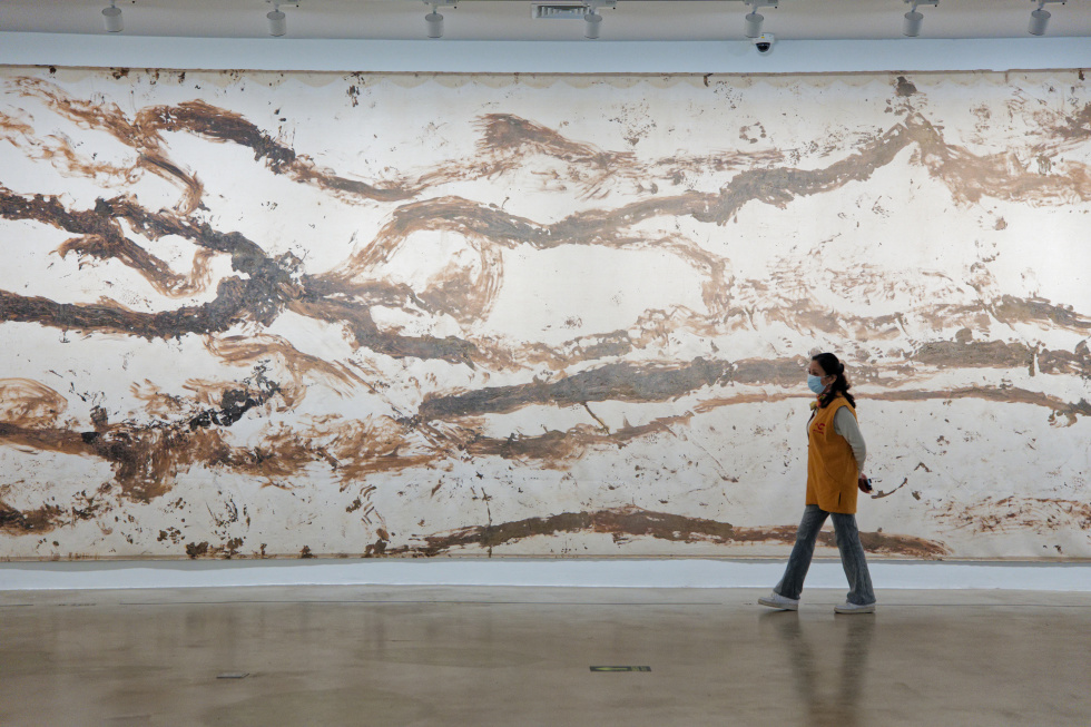 刘商英的《荒原计划20号》是本次展览中尺幅最大的作品。它完成于新疆罗布泊,艺术家将一块长17米的画布铺展在沟壑纵横的荒原地表,并俯身用蘸满颜料的双手抚摸画布,让大地的痕迹与感性的绘写相互交织,最终呈现出震撼心灵的“写生”图景。刘商英说:“在罗布泊,我每天都与严酷的自然环境进行抗争,每天都有许多风沙进入到画面中。因此,这件作品也代表了我与自然的和解。”