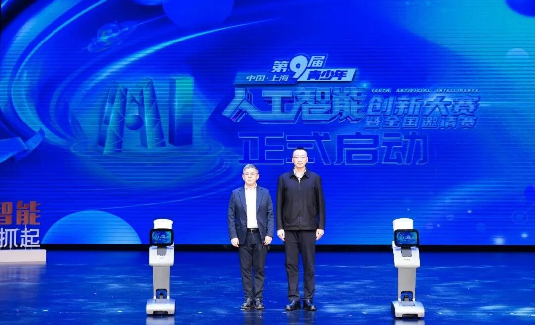 共青团上海市委副书记 徐豪(右),临港新片区党工委委员、管委会专职副主任、南汇新城镇党委书记 苗挺(左)启动第九届中国·上海青少年人工智能创新大赛暨全国邀请赛