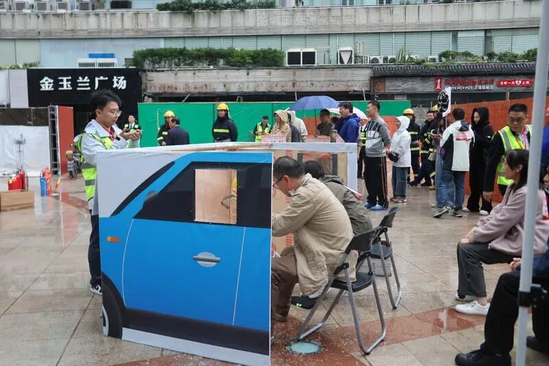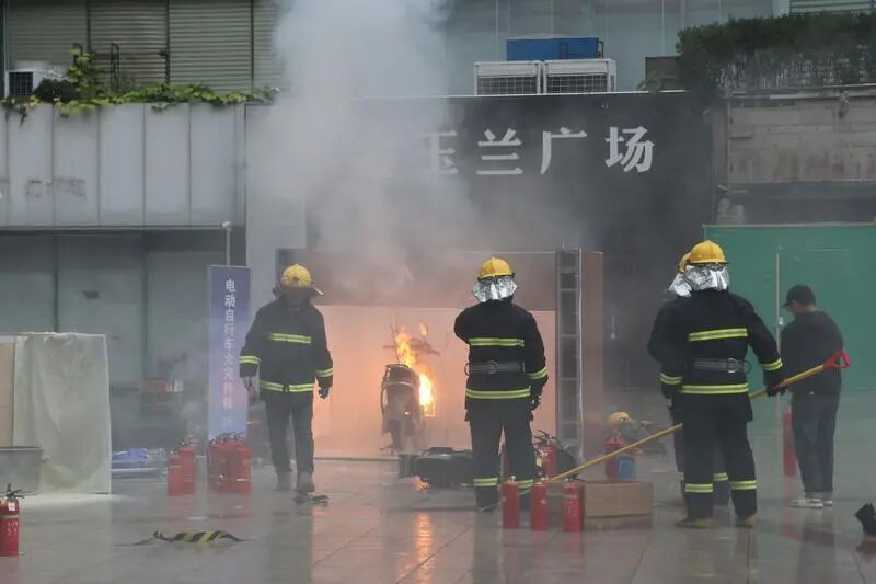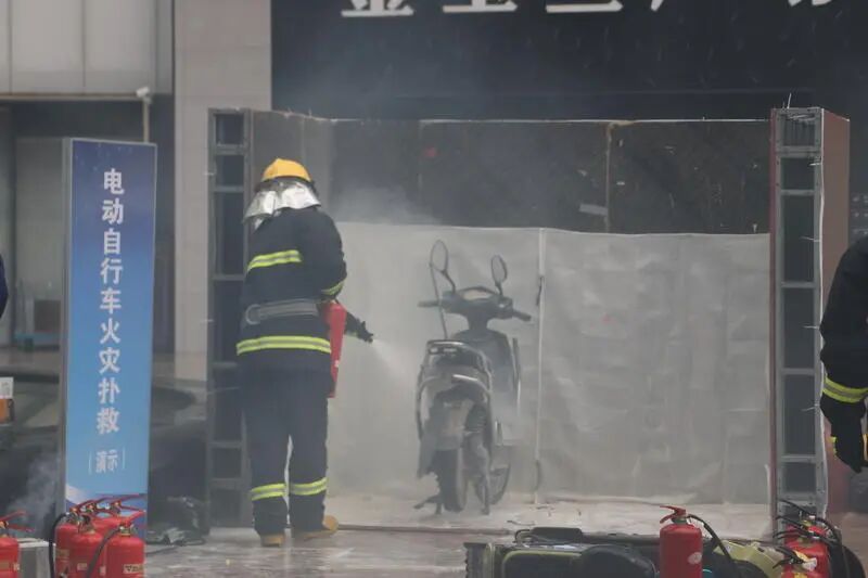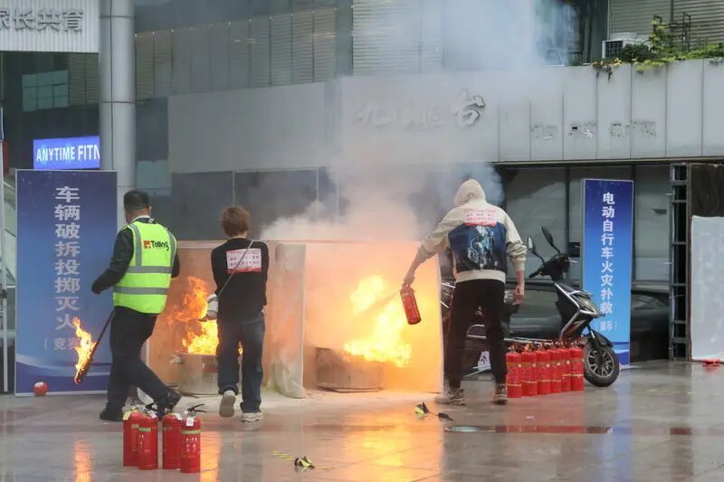 车辆破拆投掷灭火项目则模拟机动车发生火灾时的应急处置场景,选手需要使用正确的破窗方法尽快逃生,并选择正确灭火设备扑灭火源;在电动自行车火灾扑救的演示项目,打浦桥街道微型消防站的队员们现场对爆燃的电动自行车进行灭火处置,进一步加深了大家对电动自行车火灾的认识,进而引导大家规范停放、规范充电。